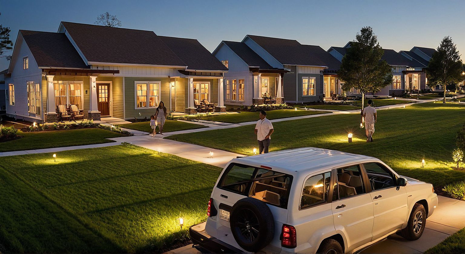 PromptDusk shot with back light in windows. Photo of a modern residential community featuring single-story homes with gabled roofs and welcoming porches with white pillars. The buildings exhibit brown wooden siding, large windows, and elegant doorways, set against a lush green lawn. Neatly paved pathways connect the houses, while families stroll nearby, demonstrating a vibrant community life. Night scene w angle, the perspective emphasizes the inviting architecture and the tranquility of the neighborhood, showcasing friendly interactions among residents.