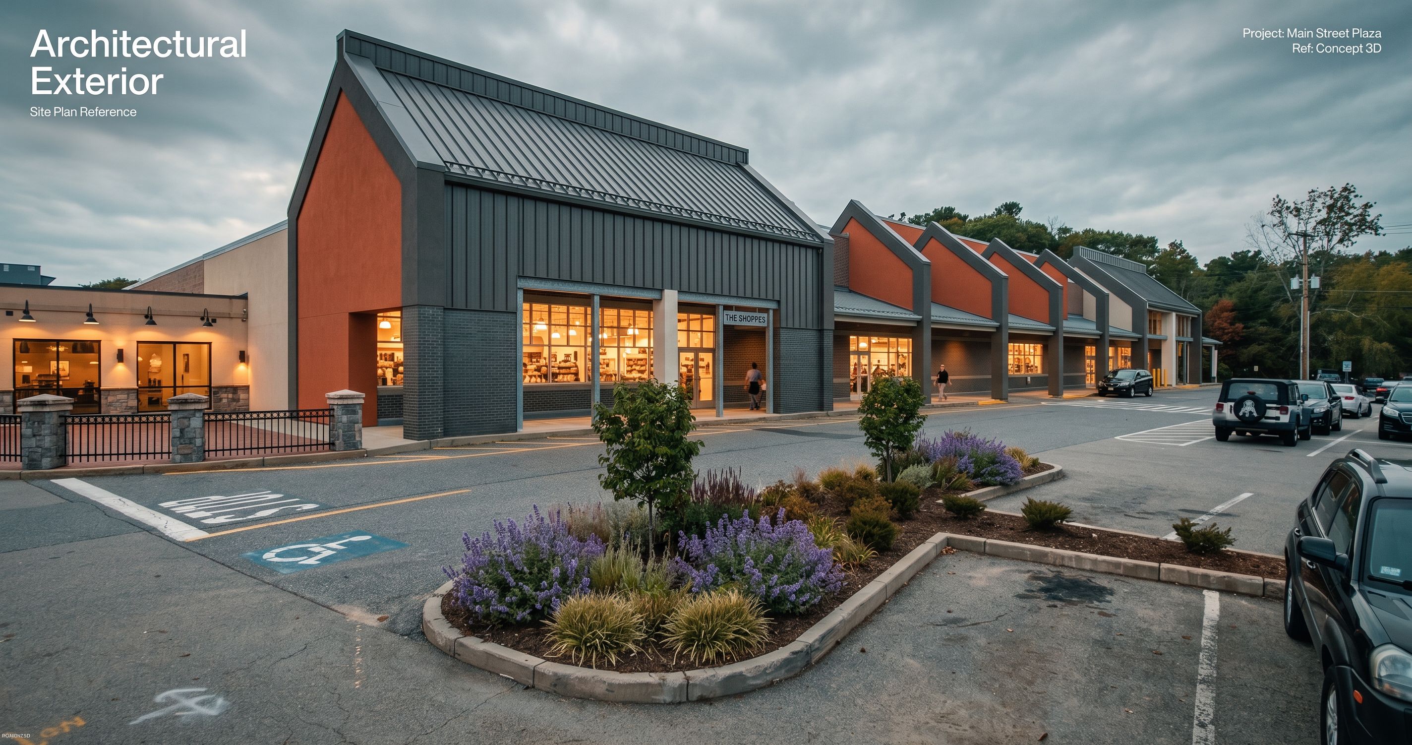 PromptPhoto of a modern commercial retail building, featuring large glass windows framed in dark metal, dark grey brick facade, and a distinctive sloped roof just like big metal barn. the interior retail is glowing and warm. Surrounded by a parking area with shrubs and trees, the building is set in a suburban landscape. Natural daylight casts soft shadows on the structure, creating a warm ambiance. Captured from a low angle with a wide lens, emphasizing the building's height and inviting entrance, highlighting the architectural details and signage against the vibrant urban backdrop. Keep the camera angle as is., keep exact camera angle