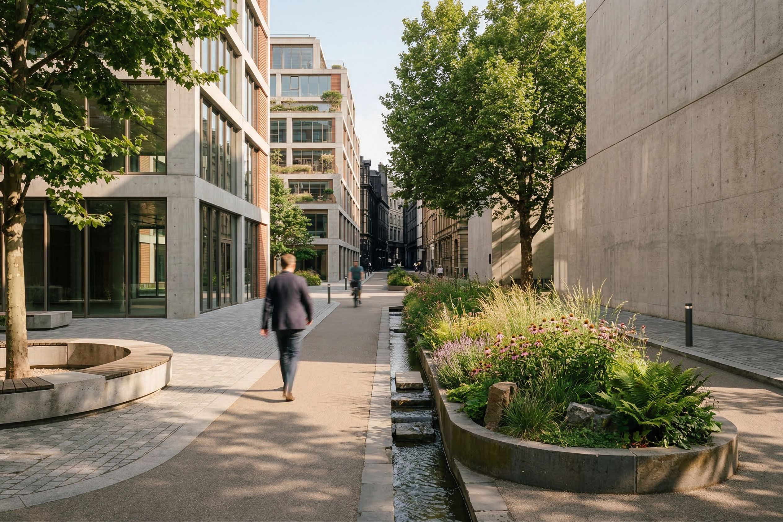 Prompteye-level architectural visualization of a pedestrian moving through an urban landscape designed for environmental remediation, preserving the exact geometry and layout of the original design. Outdoor spaces feature integrated ecological planting, including native grasses, flowering gardens, and phytoremediation landscapes that help restore the soil. Curated garden areas with seating, small plazas, and intimate outdoor rooms create a warm and intentional atmosphere. Trees are strategically placed to provide shade and define space, casting soft dappled shadows. Water features support the ecological system and blend with the landscape. Surrounding buildings in concrete, glass, and subtle terracotta brick frame the space. Soft warm daylight, realistic shadows, high-end architectural visualization, cohesive and integrated urban design.