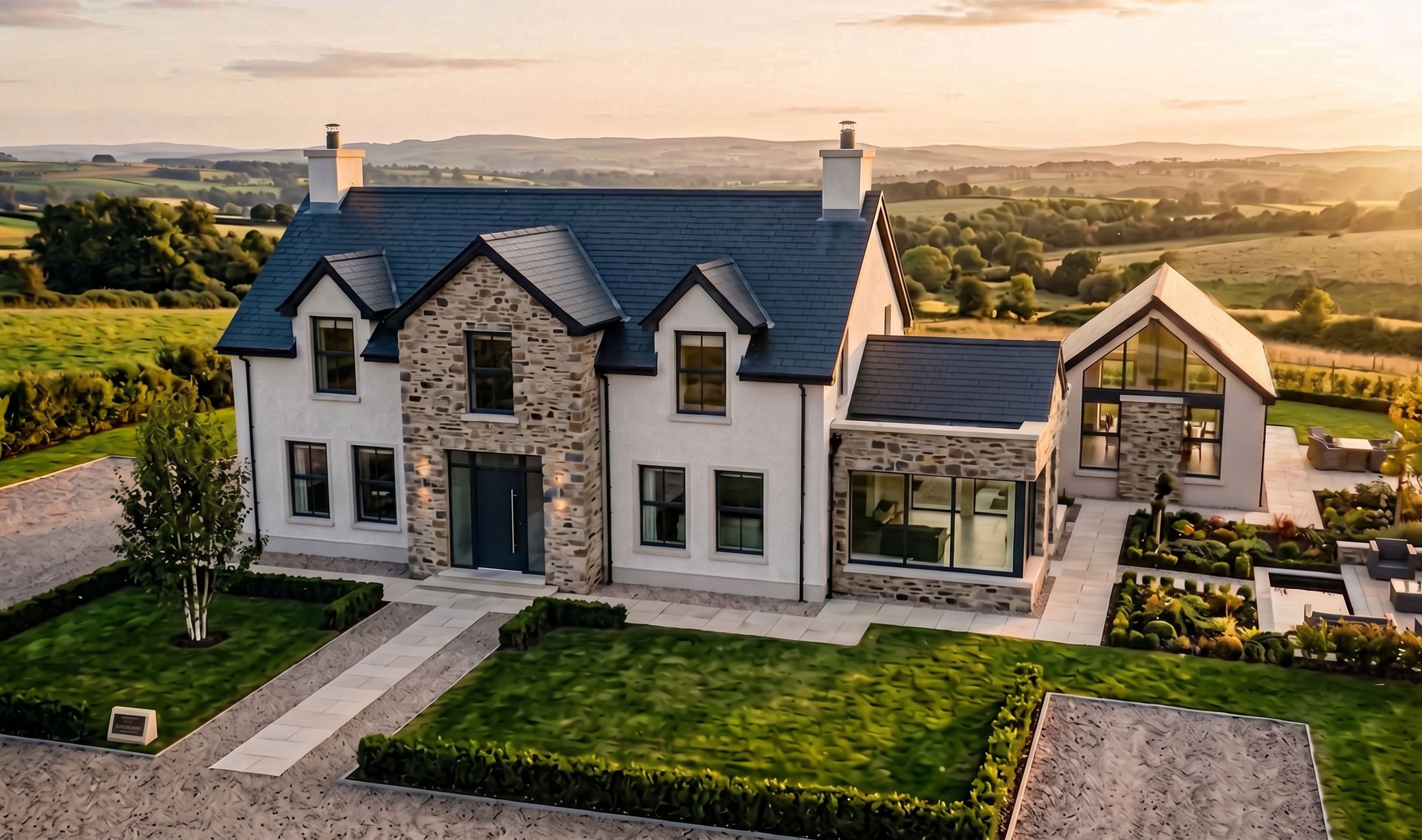Can you give me another concept with an extension on the right similar to this but with a full apex window, stone work in the middle of the primary structure and the same for the extension. Remove the straps from the corner of the house and add modern door and window frames