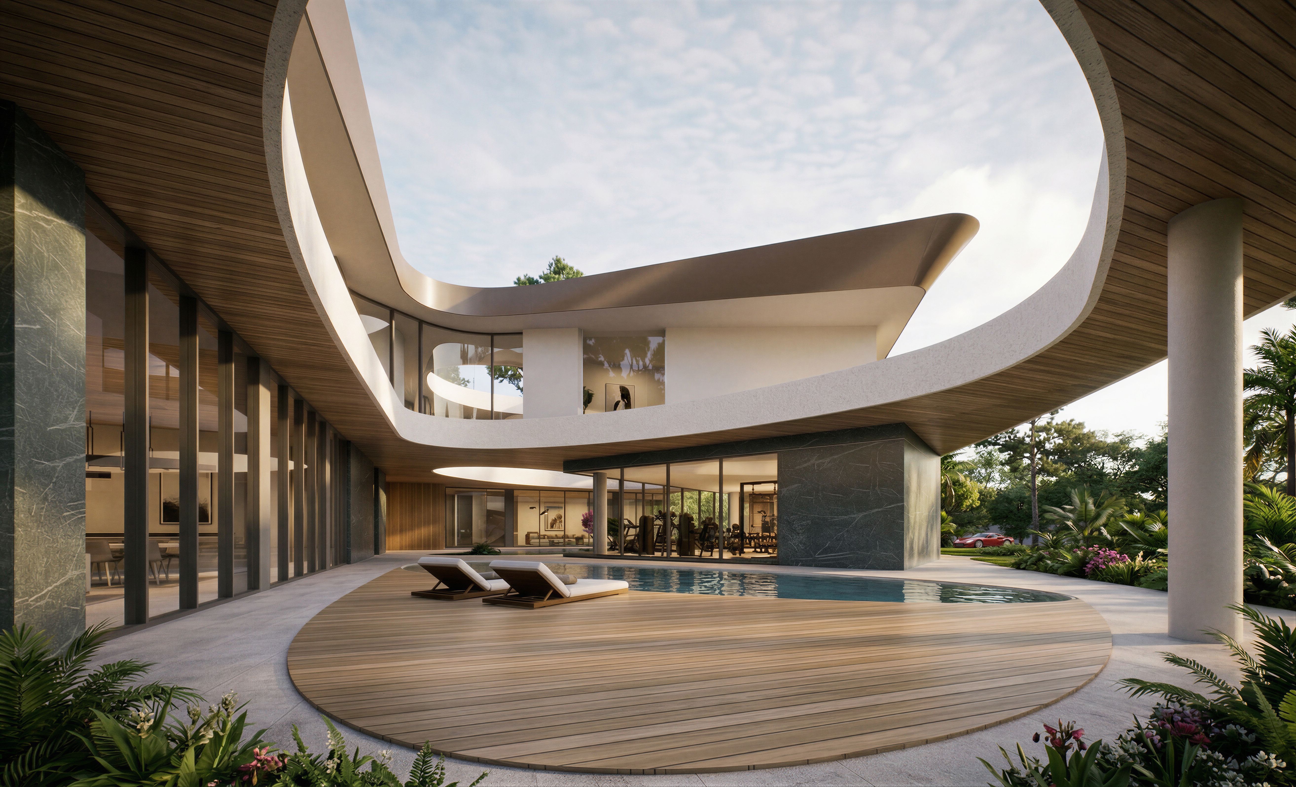 PromptPhoto of an ultra minimal luxury residential villa featuring organic architectural design with flowing curves and large glass facades. Emphasize smooth finishes of off white beam and columns, natural wood lower floor ceiling with curved pattern following the opening form, greenish gray stone wall and greyish beige limestone floor and brownish gray metallic roof edge. Highlighting a seamless integration with nature. The surrounding landscape includes lush tropical greenery and a tranquil swimming pool reflecting the structure. Morning sunlight casts subtle shadows, enhancing texture and depth. Captured at a low angle, using a wide-angle lens to capture both the building and its environment, creating an immersive view that showcases harmony between architecture and nature., keep exact camera angle