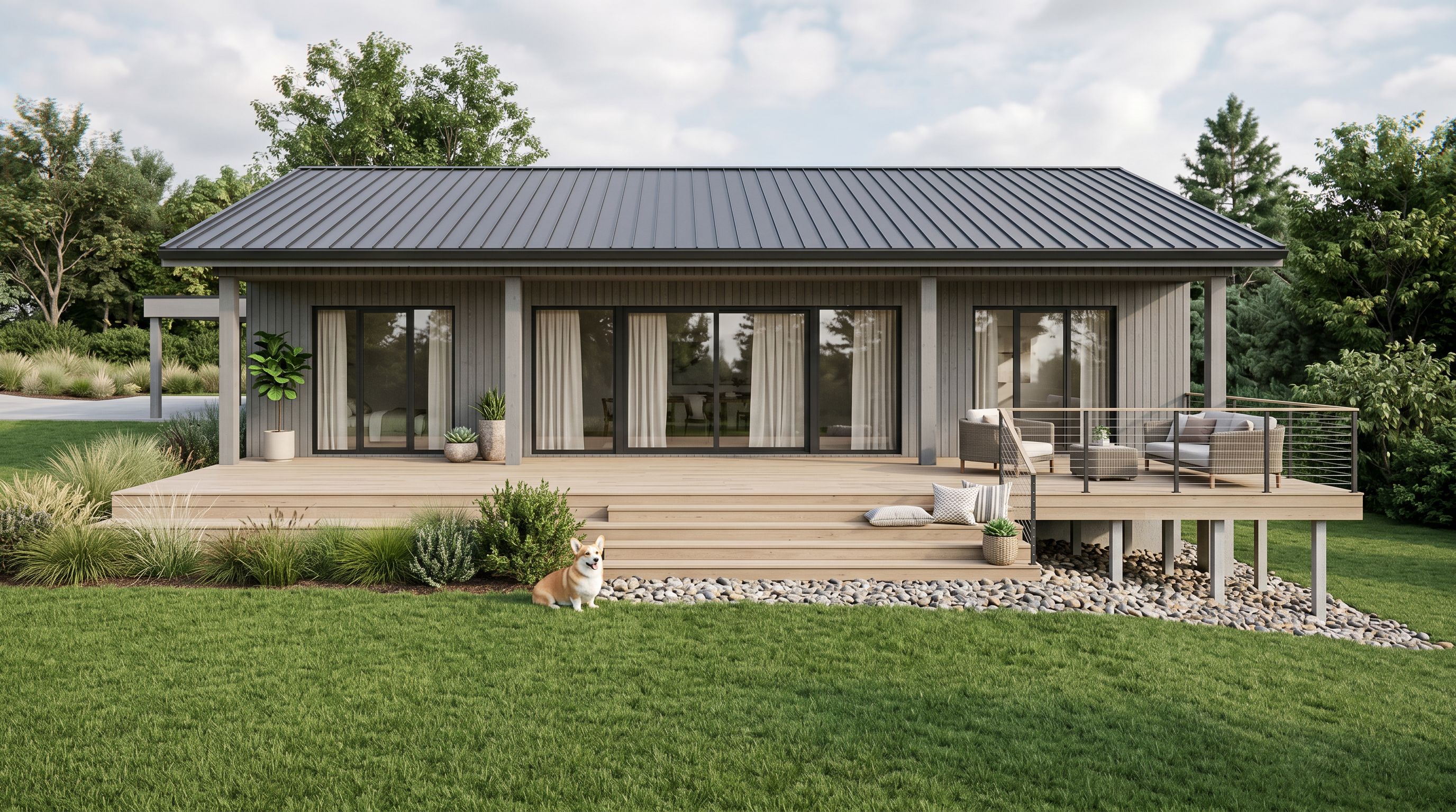 Please make a light realistic image. Add curtains. Facade is grey painted wooden boards, not aged. Grass is clean cut lawn. Add some lounge furniture on terrace, cushions on steps and a corgi dog. Add some plants. Under the terrace between concrete foundations there is a gravel or small rocks but only under terrace, not in front or elsewhere., keep exact camera angle