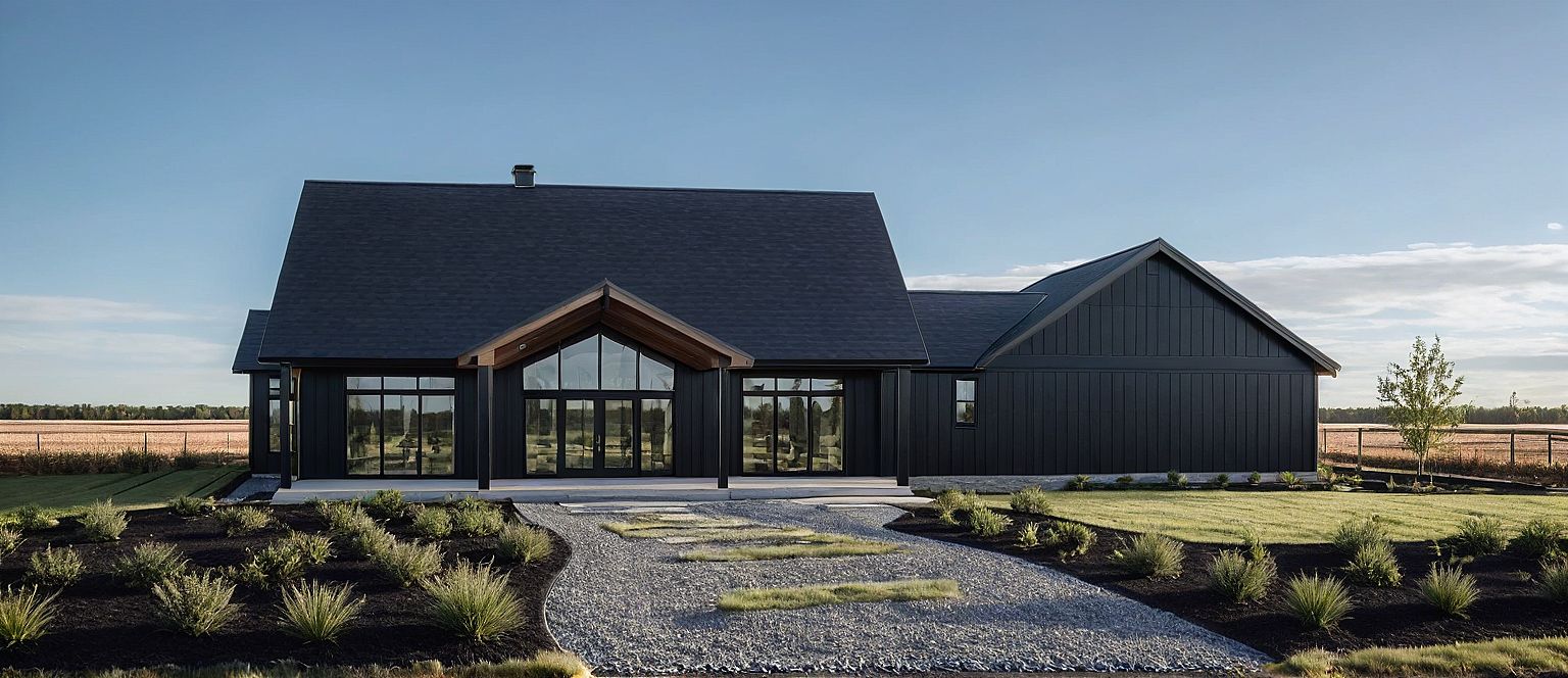 Landscaping, rural setting, modern black farmhouse