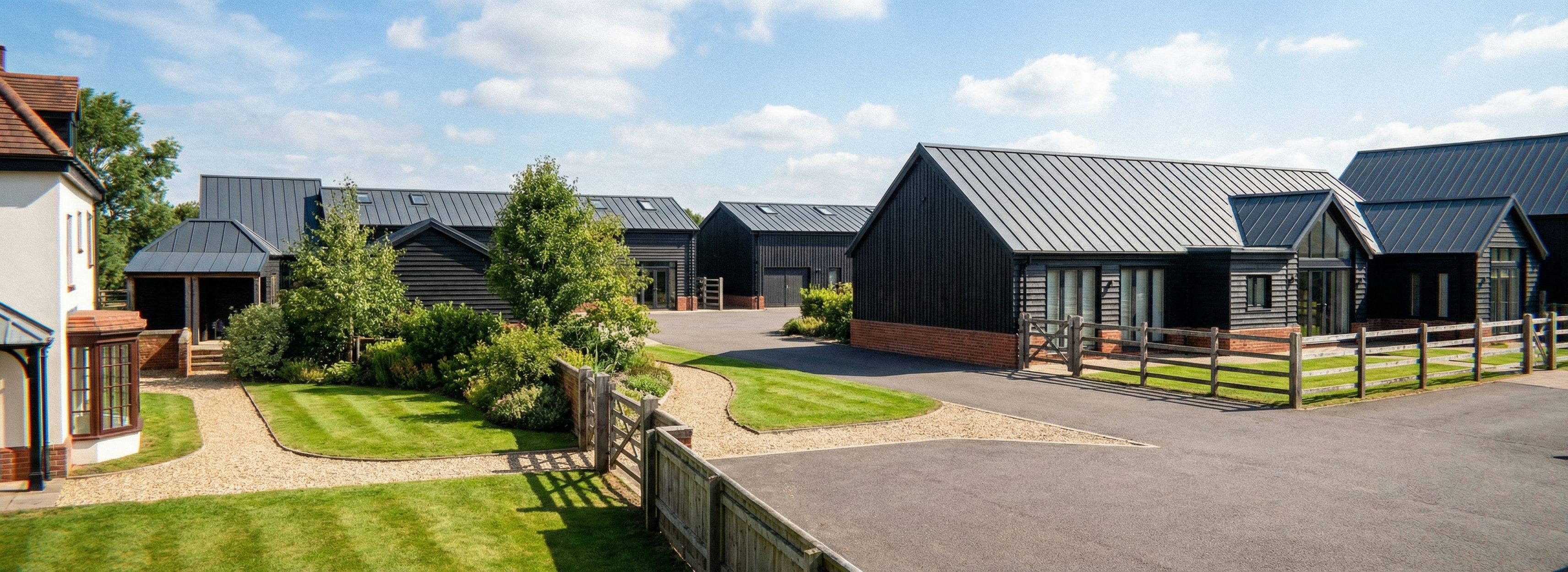 Promptbarn style, dark vertical timber cladding, red brick plinth, metal modern roof