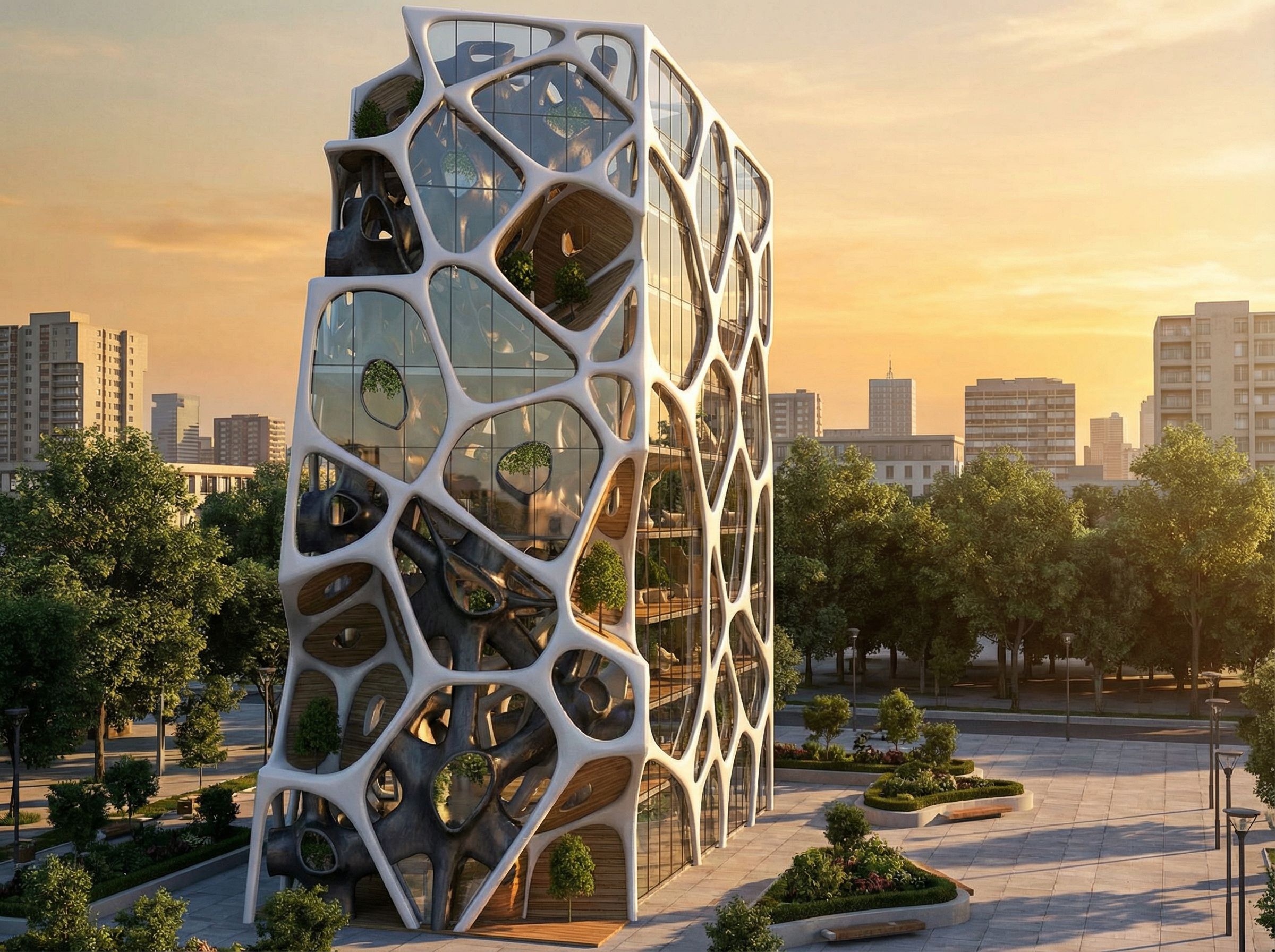 Promptarchitectural exterior rendering, render this 3D mass into photorealistic rendering, Create a more realistic image. Insert trasparente glass courtain Wall to the skyscraper. Add environment., keep exact camera angle, golden hour warm lighting, including greenery and vegetation, trees, high quality, professional, detailed scene