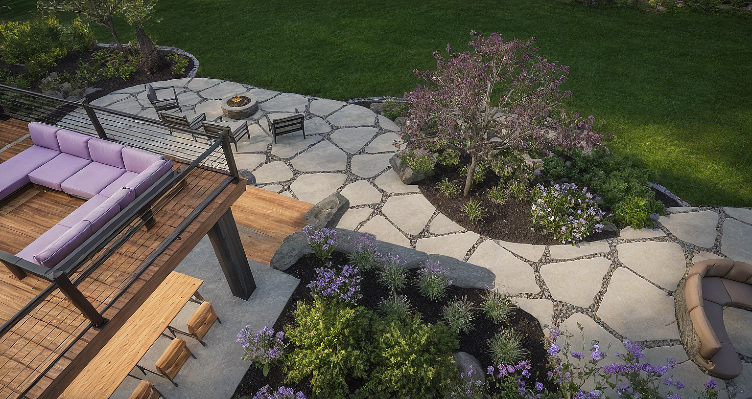Promptlandscaping, teak siding, lawn, flagstone patio, mulch, concrete driveway, lawn furniture, junipers, river birch, lilac, asters,