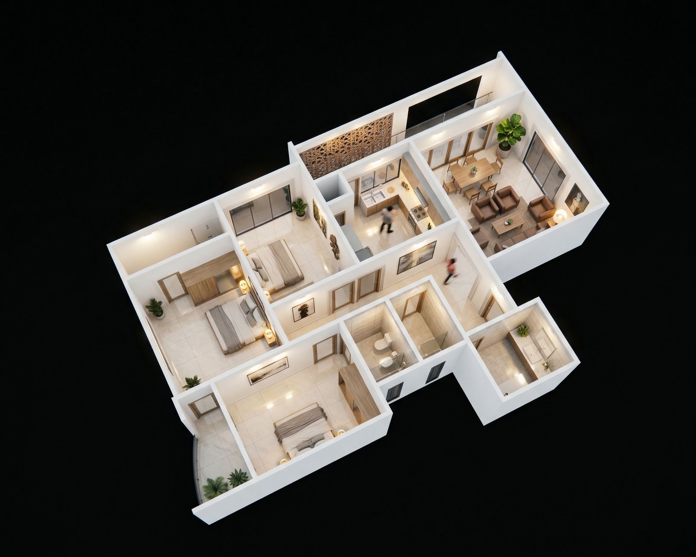 AERIAL VIEW OF A UNIT WITH LIGHTS TURNED ON IN THE HOUSE. , INCLUDE MOULDINGS IN WINDOWS AND OPENINGS. USE BRILLIANT WHITE ON THE WALLS . MAKE THE GLASS CLEAR, REALISTIC AND TRANSPARENT. USE CERAMIC TILES ON FLOOR. MAKE IMAGE BRIGHT HIGH RESOLUTION 8K WITH A BLACK BACKGROUND., keep exact camera angle