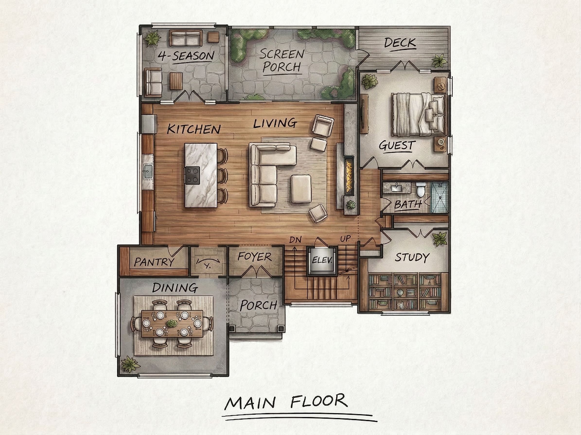 PromptRender this as a marketing plan. linear fireplace in living room. Remove people. Remove stairs from screen porch. Replace desk in study with bookshelf., keep exact camera angle