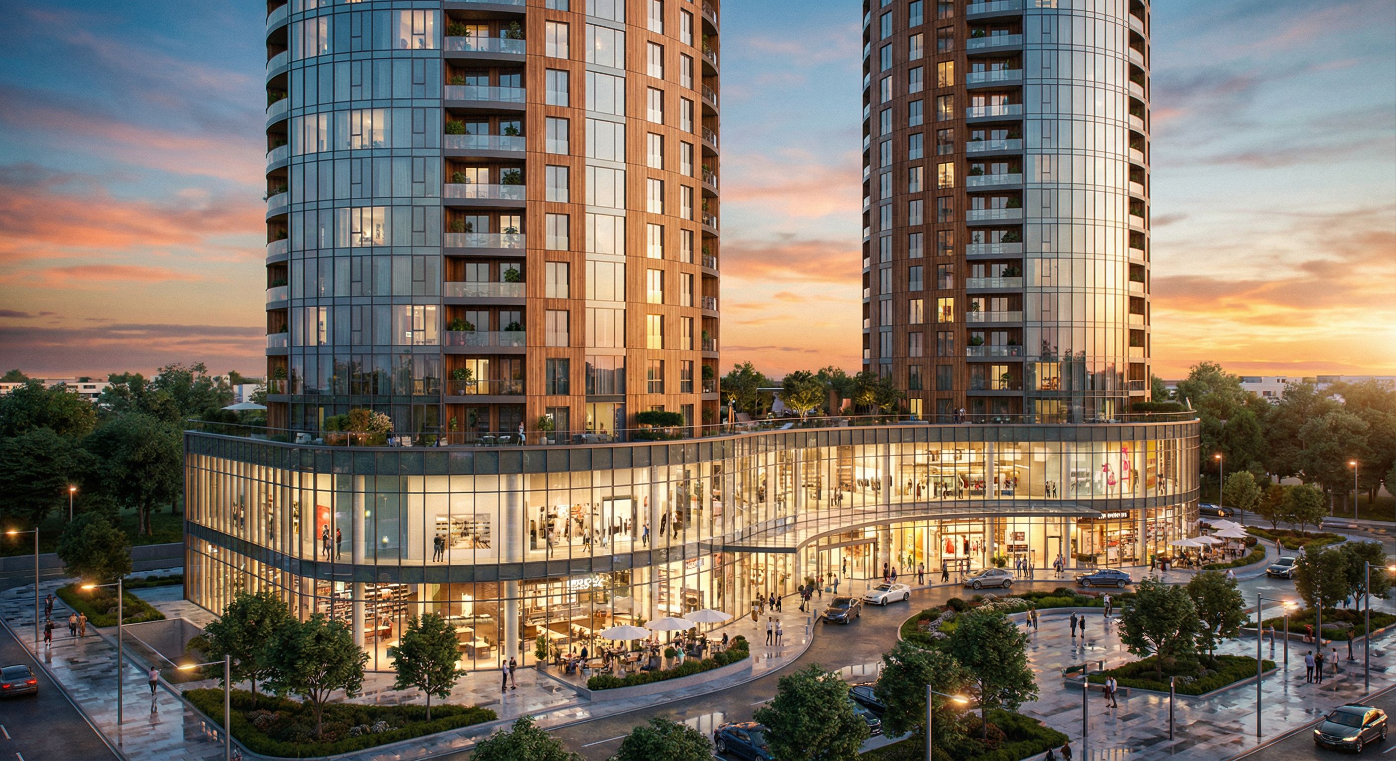 THIS IS A TWO RESIDENTIAL BUILDINGS ON A PODIUM WHICH IS A MALL COMMERCIAL CENTER MAKE THIS UILDING SUPER REAL AND ALIVE& THE RESIDENTIAL TOWERS MUST LOOK ALIVE AND THE MALL MUST LOOK ICONIC THE TWO BUILDINGD MUST BE CLADDED WITH CURTAIN WALLS AND WOOD PANELS DON'T CHNGE THE SCALE OF THE BUILDING DON'T CHANGE THE CAMERA ANGLE OR THE FRAME OF IT DON'T CHANGE ARCHITECTURE MAKE THE MALL CLADDED IN GLASS CHOOSE MATERIALS THAT CAN MAKE THE BUILDING LOOK LIGHTER IN WHEIGHT ,, keep exact camera angle
