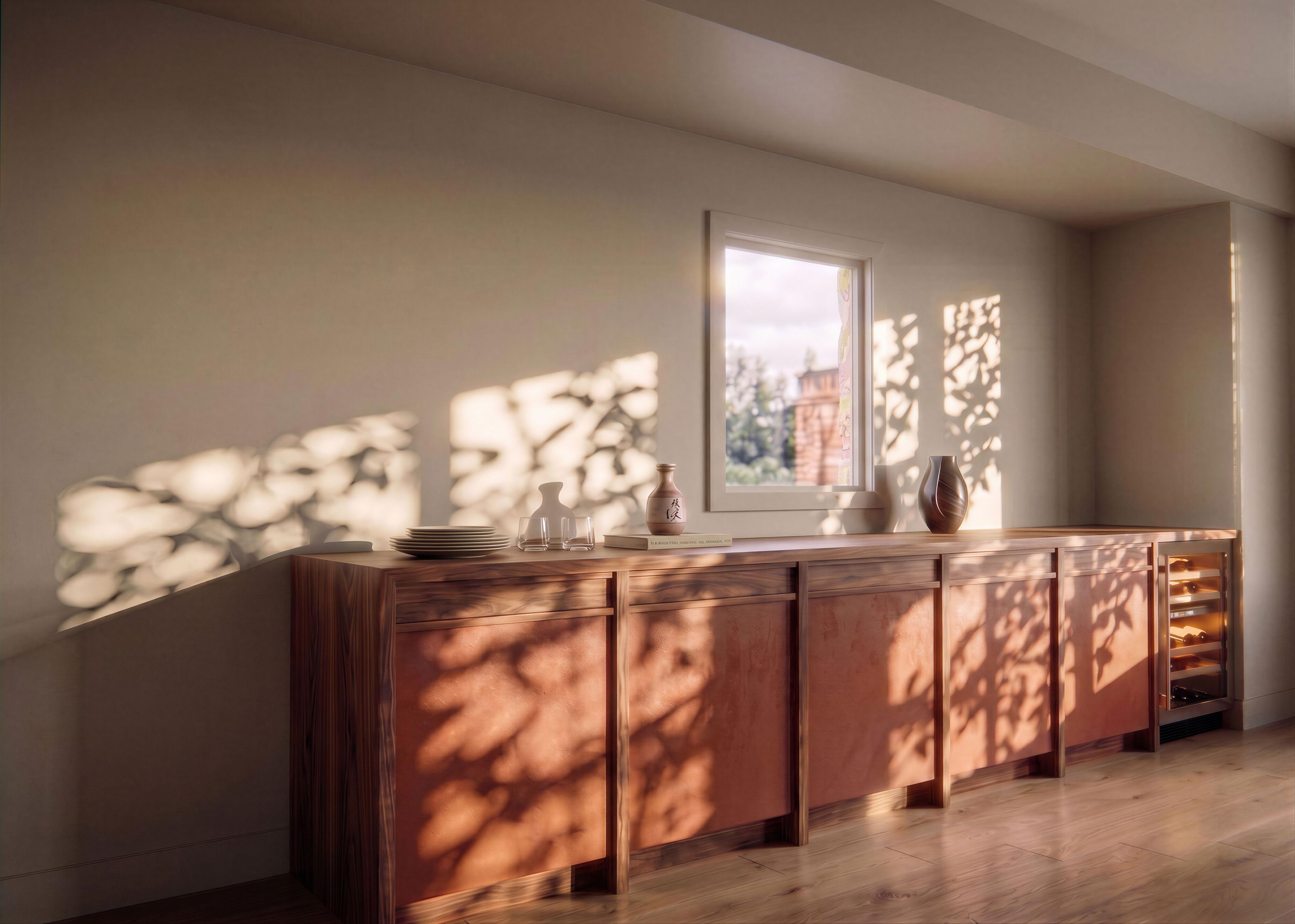 Promptdo not change millwork. make sunlight similar to reference image . make walls and bulkhead smooth painted drywall and paint grant beige hc-83 , keep exact camera angle