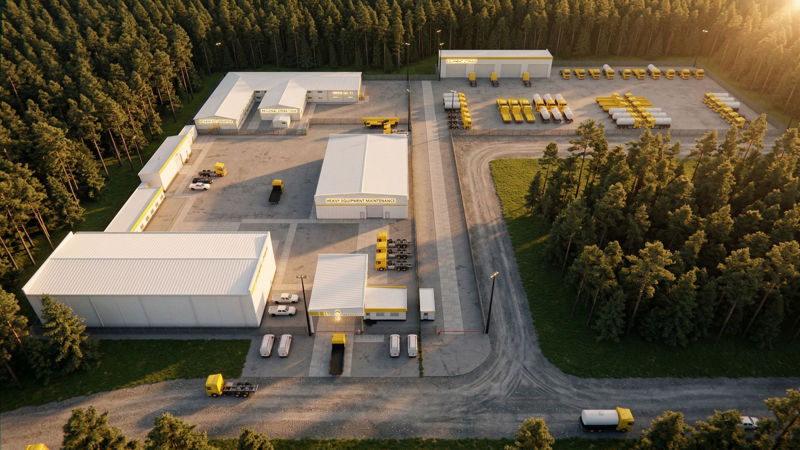 PromptPhoto of a modern industrial complex nestled among tall pine trees, featuring sleek, minimalist buildings with white clean metal roofs and building facades made of clean white sandwich panels. Surrounding urban elements include gravel roads and heavy machinery, highlighting the functional aspects of the site. Warm, golden hour lighting casts soft shadows and enhances textures of the materials. Logos glow with LED backlighting. Captured from an elevated perspective, the wide angle emphasizes the layout and surrounding landscape, offering a clear view of the harmonious integration between architecture and nature., keep exact camera angle, keep exact camera angle