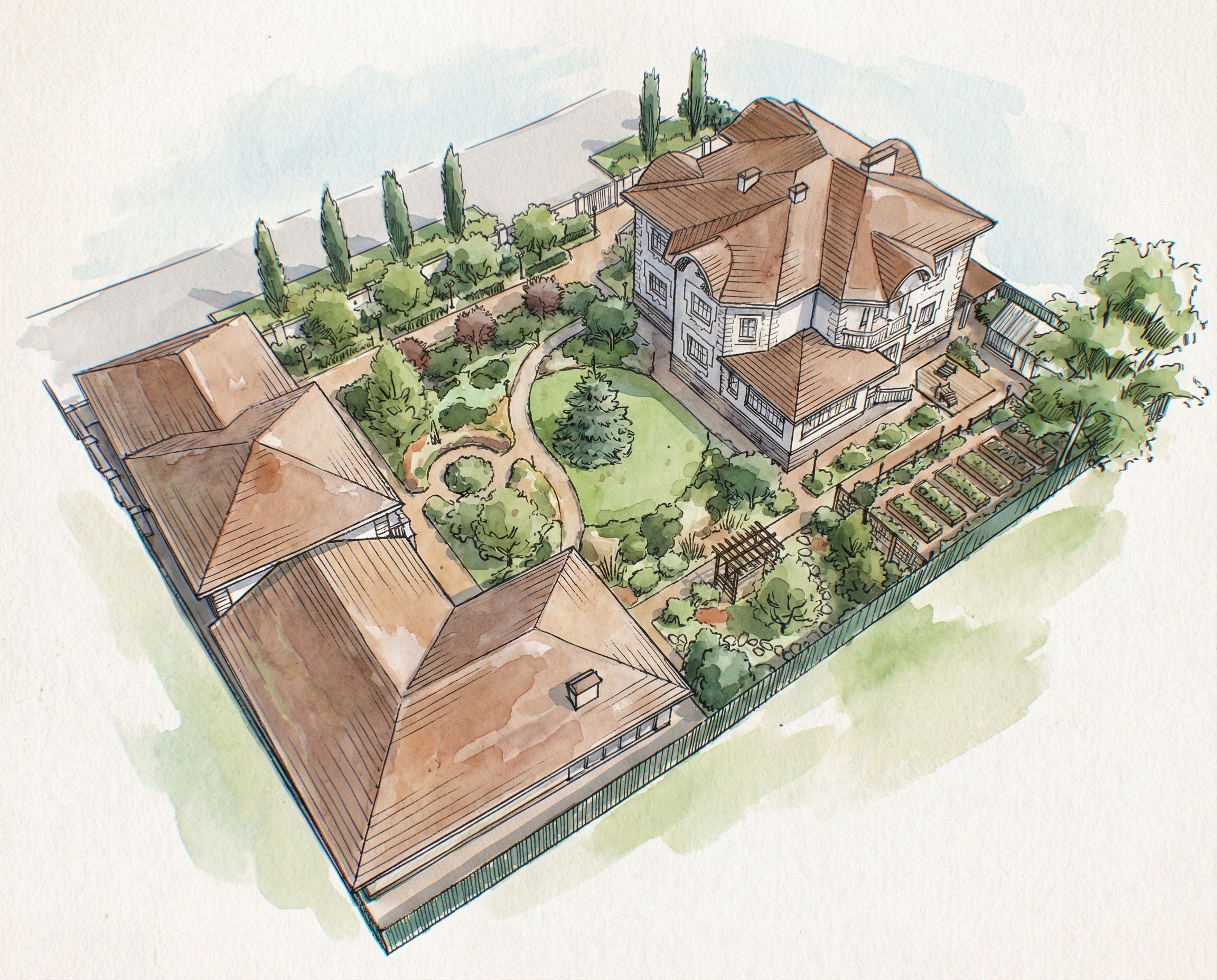 PromptTransform this garden image into a pen-and-ink sketch with watercolor wash (ink and wash technique). Black ink pen linework defining structure and details, then loose transparent watercolor washes applied over ink for color. Ink lines show through watercolor. Classic European travel sketchbook / urban sketcher style. Same scene., keep exact camera angle