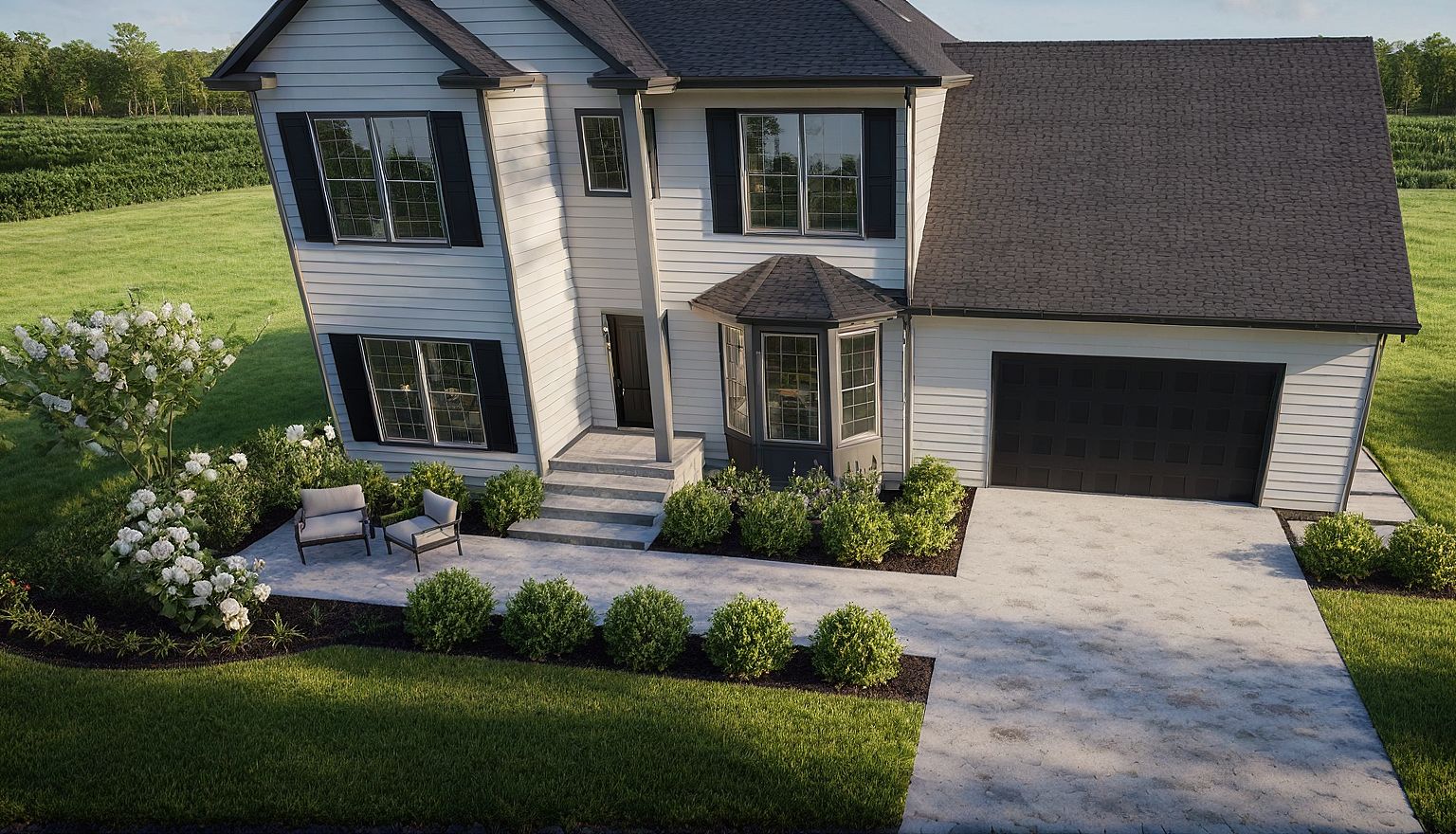 PromptPhoto of a modern two-story family home, featuring a gabled roof and a prominent front porch. Emphasize the textured siding, large multi-pane windows with black shutters, and detailed landscaping with blooming flowers and neatly trimmed shrubs. Capture the suburban neighborhood setting with open green lawns and nearby homes. Natural daylight bathes the scene, creating soft shadows and highlights on the façade. Use a slightly elevated camera angle, focusing on the house's front, with a wide-angle lens to enhance the spacious feel of the surroundings.