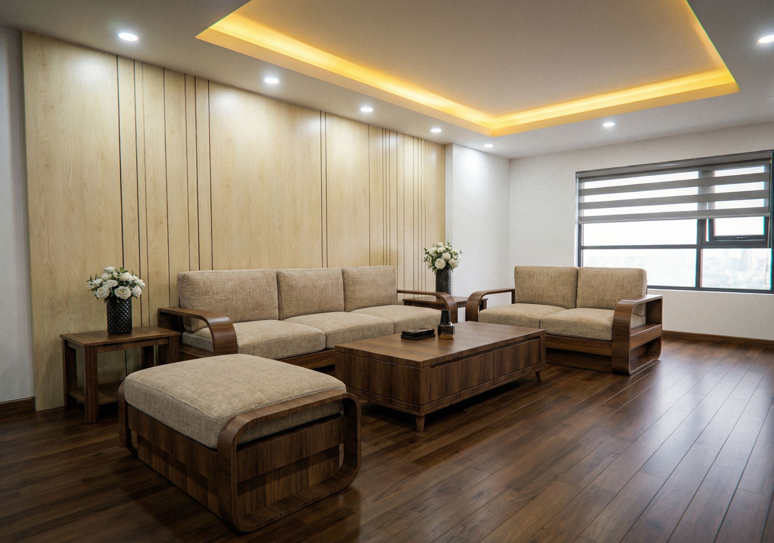 PromptCreate a living room image with wood paneling on the wall using An Cuong's MS468 MFC wood in yellow-white. The sofa set retains the same design as in the image, made of walnut wood with beige fabric cushions. The coffee table and corner table are made of walnut wood. The ceiling uses white downlights, and the recessed ceiling lights use yellow light. The original design is retained., keep exact camera angle