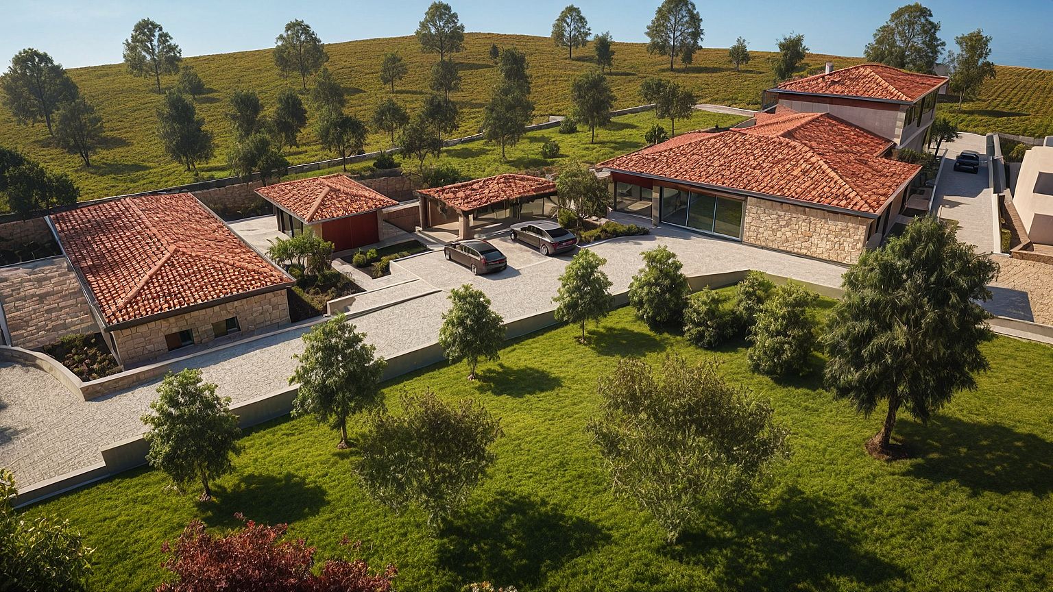 PromptPhoto of a modern villa featuring a striking brown plaster and natural stone on facade and red roof tiles, showcasing clean lines and large glass windows. The building is complemented by a beautifully landscaped garden casting warm, golden light and soft shadows across the structure. vibrant sky. The scene is framed from an angular perspective, highlighting the architectural details of the villa while capturing the interplay of natural light and shadows.