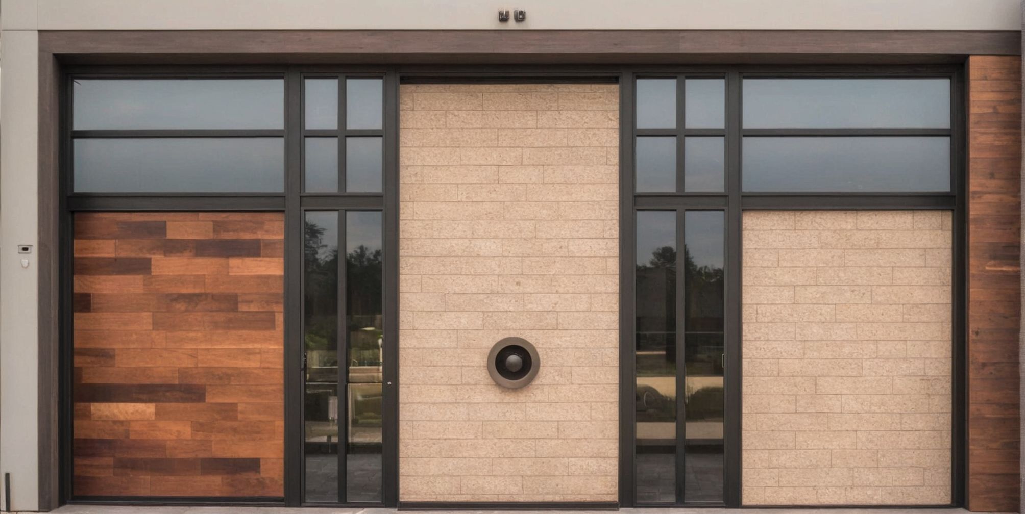 PromptPhoto of a modern entrance design featuring a symmetrical layout with walnut wall panels. Architectural details include sleek black frames and large bronze glass panels, creating an elegant contrast. This is photo of a courtyard, with landscaped area which is desert modern with a large Palo Verde Tree that is off centered and the landscape materials is placed up against walls which creates a path to the front door, also incorporate desert boulders and ground material is tidy bronw dirt, The path is made of concrete aggregate in earth tones color. This a photo of a courtyard entrance where the two side walls that flank the entrance are of walnut wall cladding and bronze glass matching the entrance. The entrance door is set back 30' and the side walls are 30' in depth with same dimensions as photo. the setting feels inviting yet contemporary. Natural daylight filters in, casting soft shadows that highlight the textures of the wood and glass. Captured from a top-down angle with a slight tilt, the composition enhances the focal point of the entrance, emphasizing its clean lines and sophisticated aesthetic. Light the photo similar to reference image