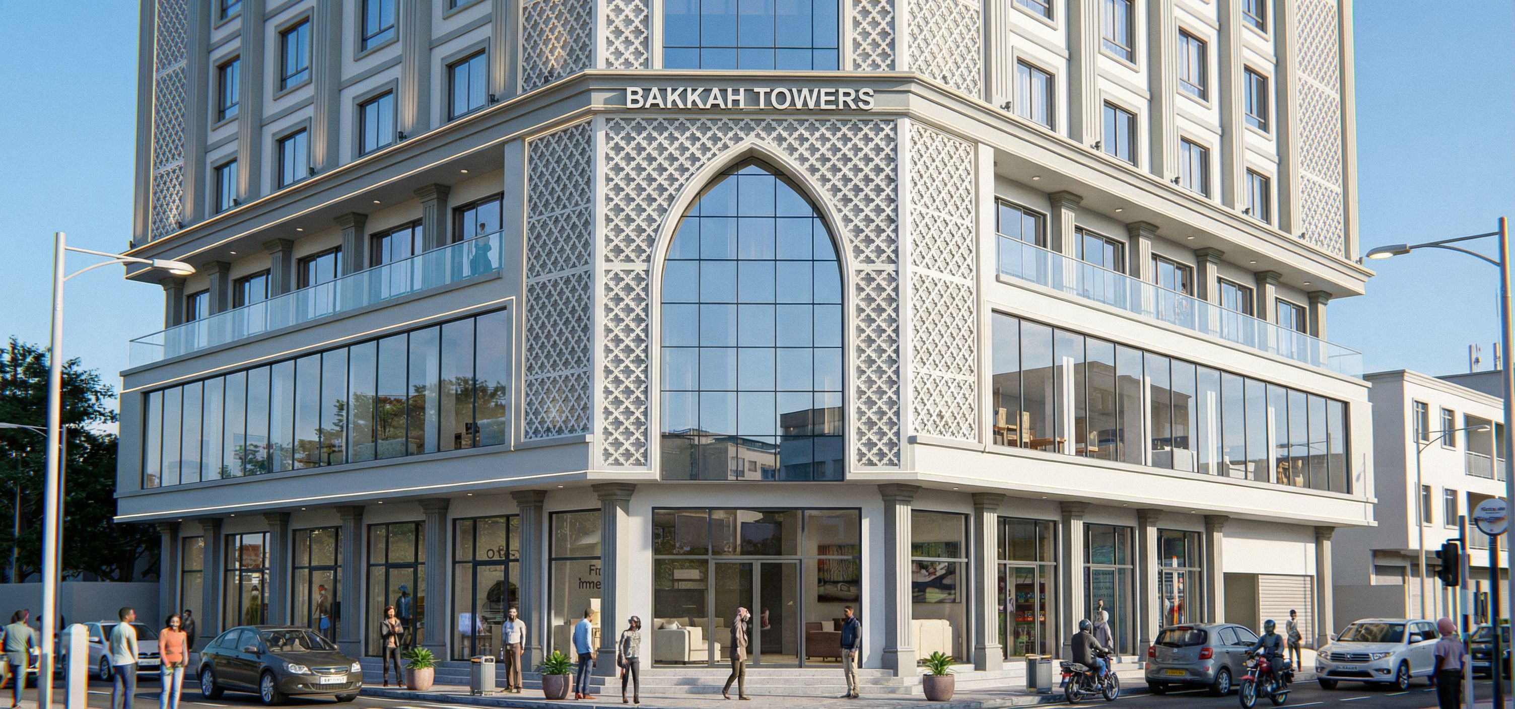 MAKE GLASS CLEAR, REFLECTIVE AND REALISTIC. USE THE COMBINATION OF COLOURS IN THE REFERENCE IMAGE. WRITE NAME"BAKKAH TOWERS" AT THE TOP CORNER JUST ABOVE THE ARCH. MAINTAIN NUMBER OF LEVELS OF BUILDING AND CAMERA ANGLE. INTRODUCE CURTAIN WALLING BEHIND THE LATTICE WORK. RENDER OF A BUILDING IN EASTLEIGH AREA IN NAIROBI DURING THE DAY. TWENTY STORIED BUILDING WITH GROUND FLOOR AS COMMERCIAL, FIRST FLOOR FURNITURE SHOP WITH CLEAR GLASS AND SECOND FLOOR SHOPS WITH GLASS BALCONY. THE REST OF THE FLOORS APARTMENTS. SHOW THE WHOLE BUILDING TO THE TOP AND INTRODUCE CURTAIN WALLING BEHIND THE MASHRYABIYA. USE COMBINATION OF A LIGHT PASTEL GREY AND WHITE ON THE BUILDING. INTRODUCE ROPE LIGHTS , STREET LIGHTS AND SPOT LIGHTS IN THE BUILDING. MAINATIN DESIGN OF ORIGINAL IMAGE, CHANGE COLOUR ONLY. USE SHADES OF BEIGE ON THE BUILDING. AMINTAIN CAMERA ANGLE. CHANGE COLOUR TO THE COMBINATION OF TWO COLOURS IN THE REFERENCE IMAGE., keep exact camera angle