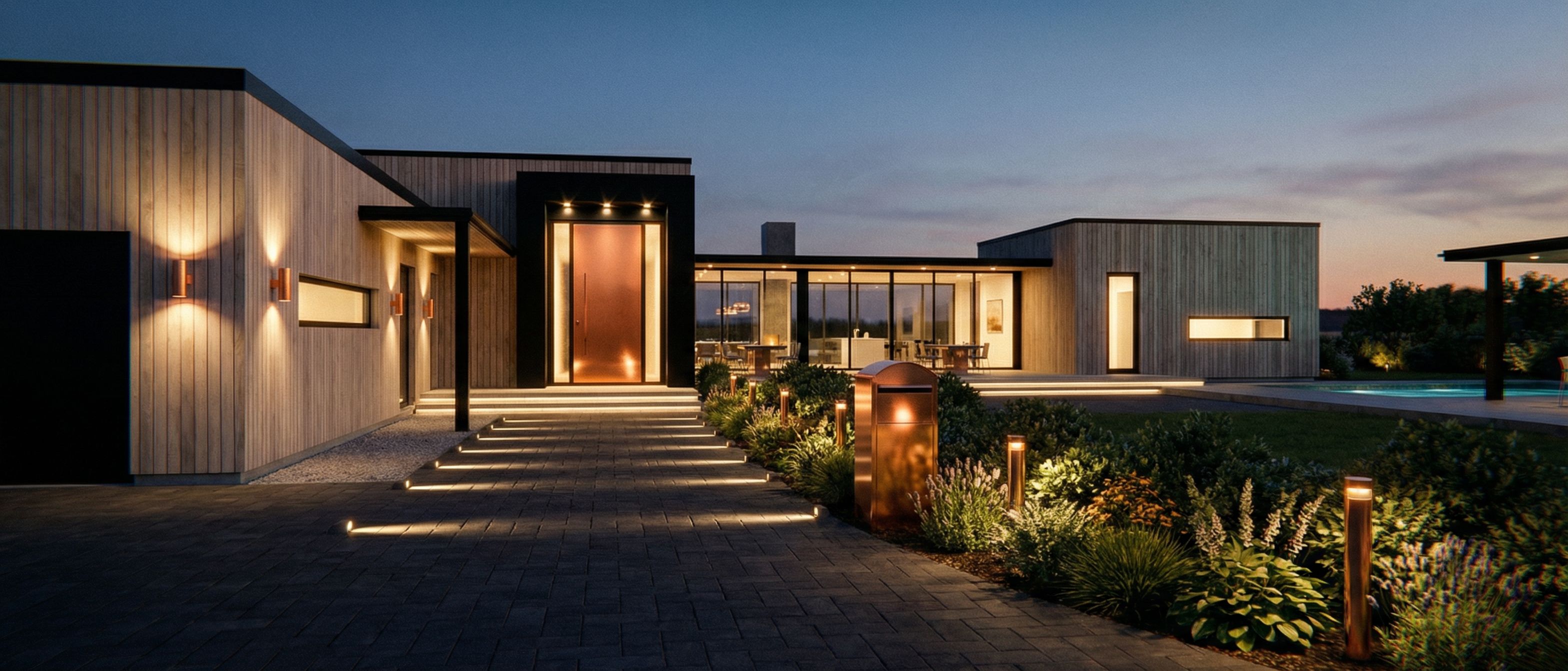 Promptshiny copper door with black frame. only the door in copper.. Entrance with led spot lights integrated in the floor on both sides. Spot lights inside top of door frame. Copper Lights leading towards entrance on the wall to the left. Copper lights by the plants on the right side of the pathway towards entrance door. grand copper mailbox by the plants between the road towards the garage and the pathway towards the entrance door.