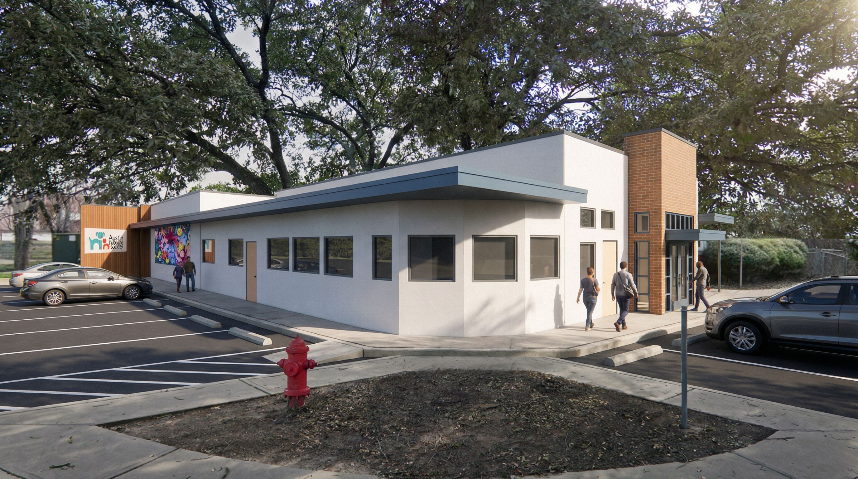 modern design with clean white base and tasteful color accents, focusing on blue and warm wood. accent wall to the left is ipe, and entry to the right is a warm brick. base white is assumed to be stucco, blue canopy to be a blue/gray aluminum type, gray tinted glass, keep exact camera angle