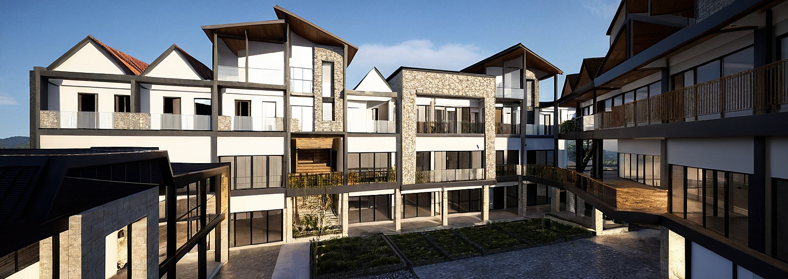 GENERAR PROPUESTA CON ARQUITECTURA DE LA CIUDAD DE SAN CRISTOBAL DE LAS CASAS, CHIAPAS, MEXICO, TECHOS NEGROS CON PLAFOND DE MADERA EN PARTE INFERIOR,MUROS PRINCIPALES CON PIEDRA LAJA Y MADERA DE LA REGION, BARANDALES DE HERRERIA CON VEGETACION EN PARTE FRONTAL DE LOS MISMOS, COLUMNAS EN PLANTA BAJA CON PIEDRA LAJA, RESTO DE ELLAS EN ACERO COLOR CAFE OBSCURO, ANDADORES EN CONCRETO LAVADO, ESTACIONAMIENTO DE CONCRETO. AUTOS EN ESTACIONAMIENTO, ESCALAS HUMANAS EN ANDADORES.