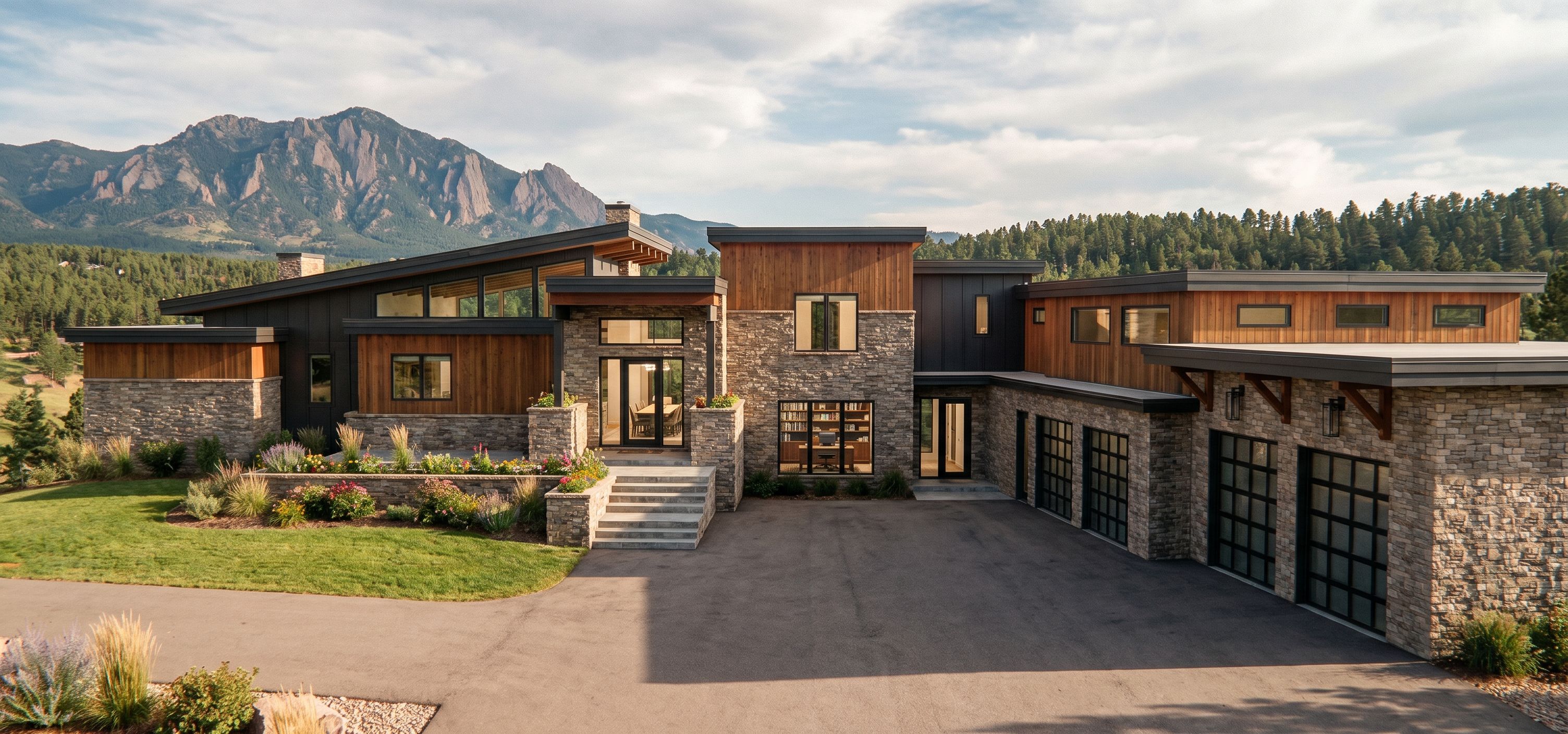 Keep the exact same camera angle and composition of the original model view—do not alter perspective, framing, or proportions. The project is located at 520 Sunny Glen Court in Woodland Park, Colorado. it will be on a hillside looking down the hill with forest far in the back. There will be no basement. Design the home using a balanced blend of natural and modern materials, including Natural stone where stone is shown. Warm stained wood siding and soffits where wood is shown. Dark metal panel where metal is shown along with the fascia's. Overall style should feel like a high-end Colorado mountain modern home— with clean and minimal landscaping keep exact camera angle. There will be a view of the north side of pikes peak in the background on the middle-left. Keep the driveway to the extent that it is shown do not add anything more. Through the front door will be the dining room. The 3 large ground floor windows to the right of the entrance will be a study. The stone walls around the columns and front patio are planters which will have plants and flowers in them. , keep exact camera angle