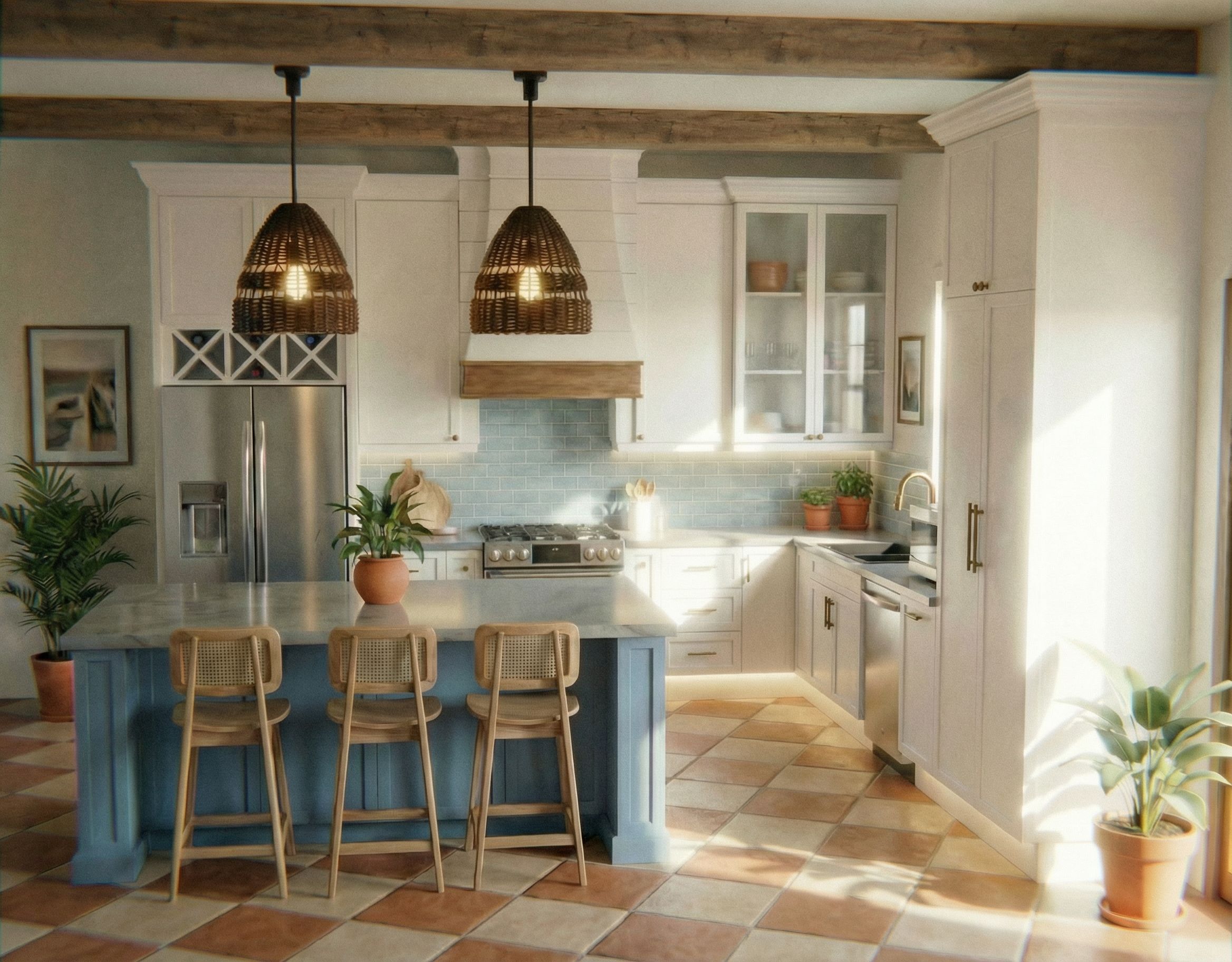 The glass cabinet area must protrude past the other upper cabinets, show it deeper than the rest of the cabinets, the crown moulding should follow the depth as well showing the jog out from the rest, no toe kick under lighting, 4K HD QUALITY, NO BLURS, WHITE WINE RACK, ANTIQUE BRASS CABINET HANDLES AND FAUCET, BROWN WINDOWS WITH WHITE TRIM, keep exact camera angle