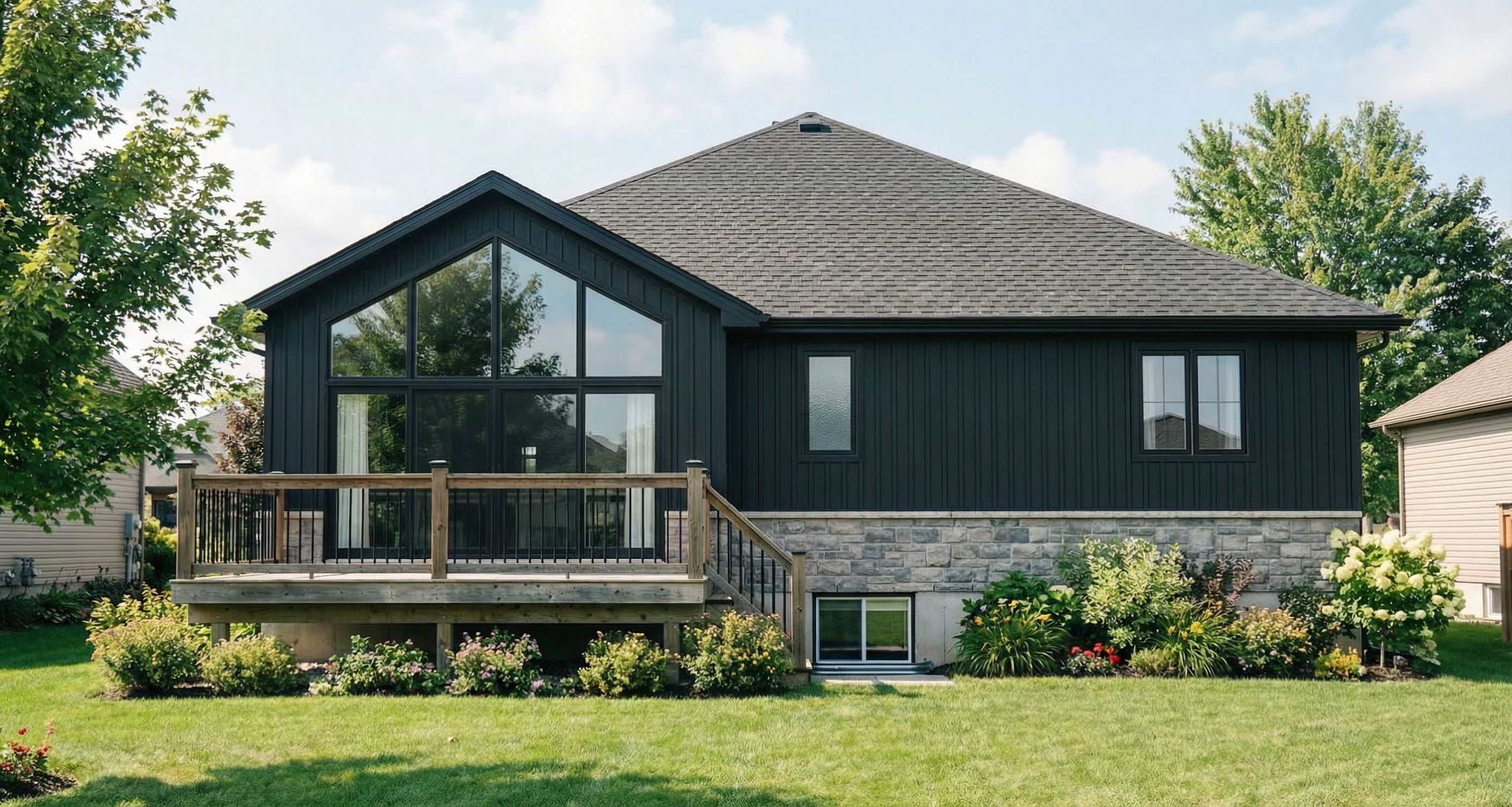 rear elevation showcasing the uncovered sundeck, wood deck and railings with black aluminum spindles, frosted small window, grass rear yard to match finishes from the referenced photo, keep exact camera angle