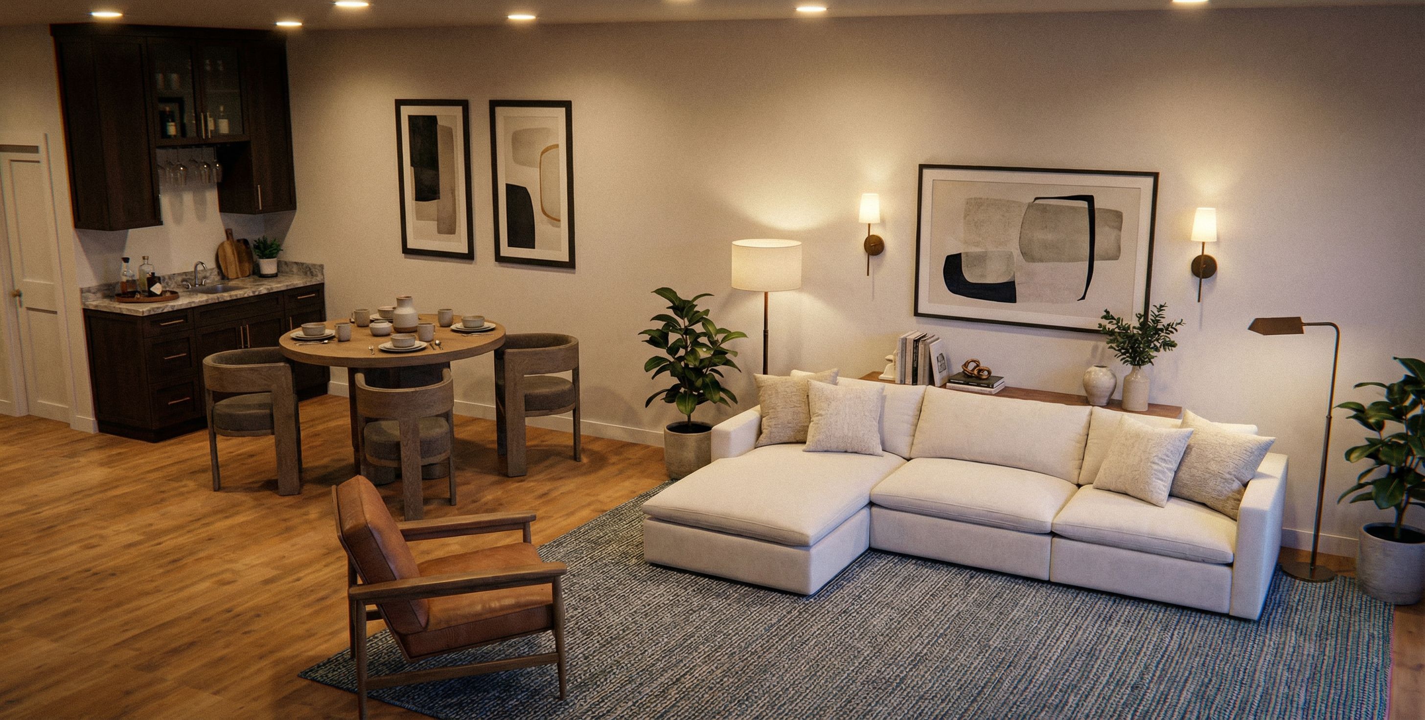 PromptPhoto of a cozy, modern basement living space featuring an open-concept design. Highlight the stylish sofa with soft cushions, a minimalist wooden dining table surrounded by sturdy chairs, and a sleek bar with dark cabinetry. Emphasize warm wooden flooring and a textured area rug. 6 overhead pot lights that are on, cozy wall lighting or lamps, Capture the scene from a slightly elevated angle, using a wide-angle lens to enhance the spaciousness and inviting atmosphere of the interior., keep exact camera angle