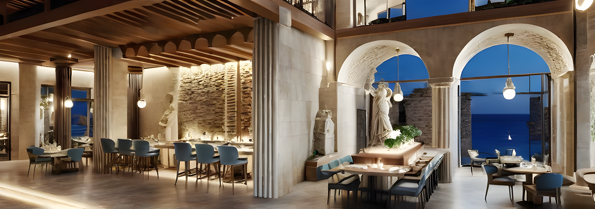 PromptCreate a realistic render of a modern restaurant with Greek architectural style, featuring Roman or Greek columns and ancient ruin-like walls combined with glass elements, as if emerging from Poseidon’s ruins. Use sleek, modern furniture and Greek statues for decor. The design should blend ancient elegance with contemporary luxury. The predominant texture should be microcement