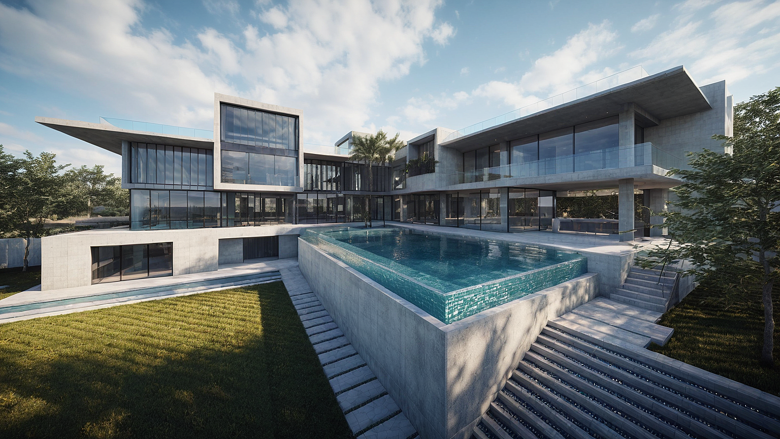 Promptsuper modern house built in concret with glass windows . furniture and linear lights in the inside. stairs in concret. morning . waterpool mosaic