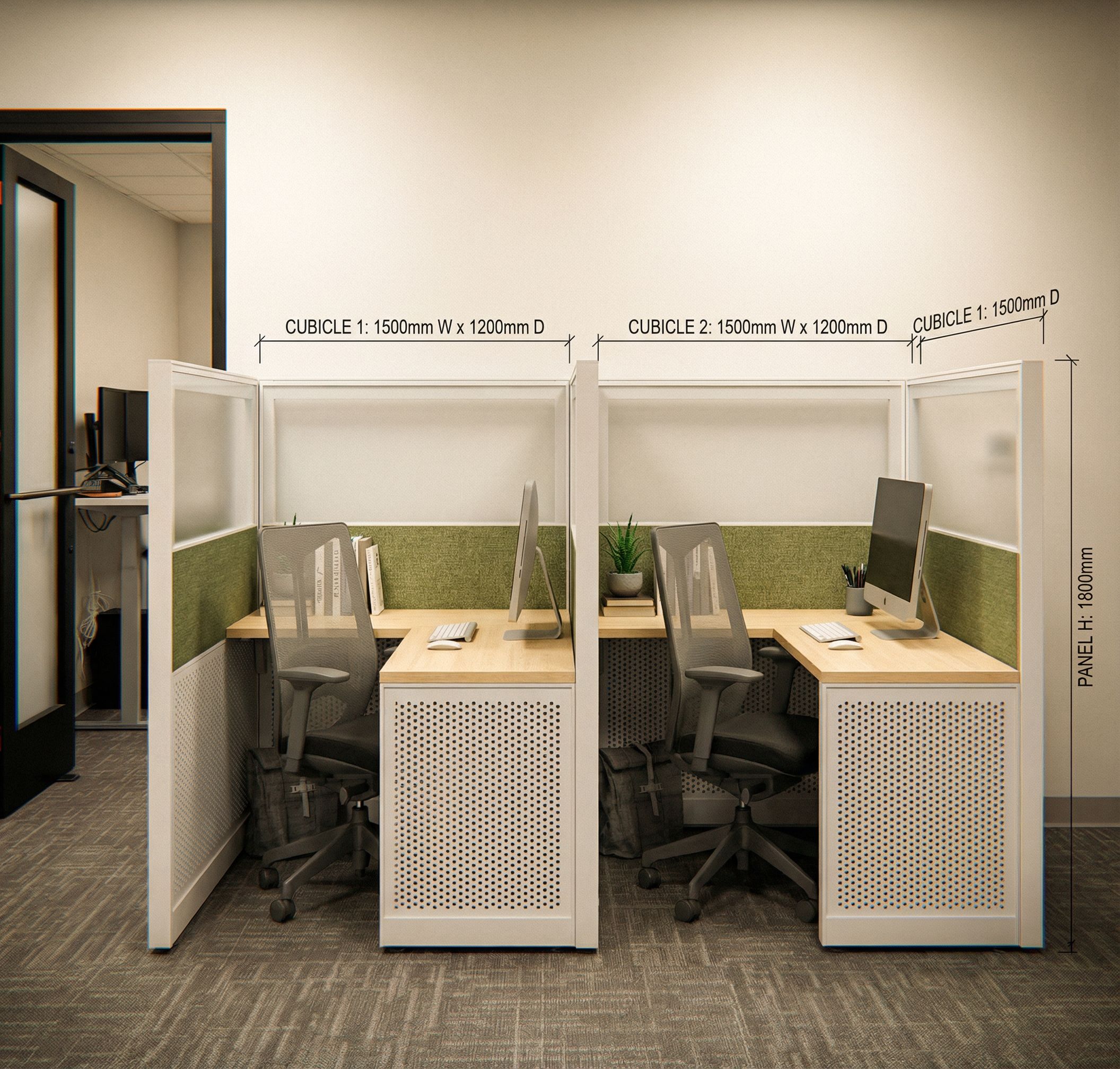 Create 2 side by side modern compact semiprivate workstation cubicles from the Reference 1 image., keep exact camera angle