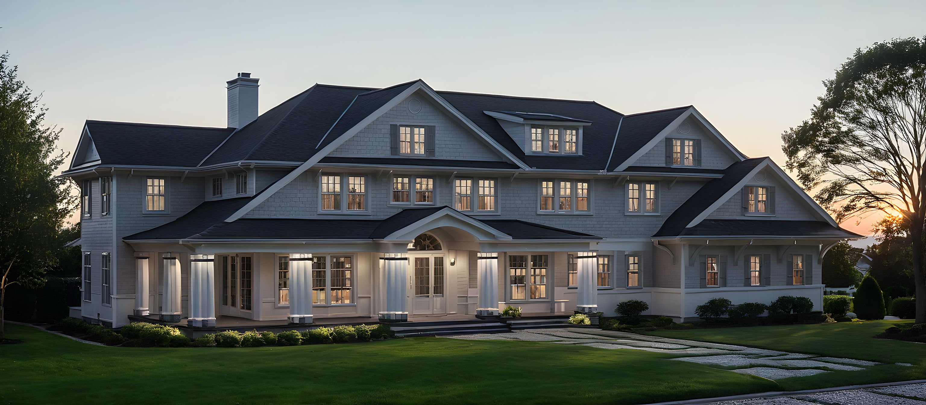 Promptlight grey shingle style black roof lush lawn and landscaping Belgian block driveway white trim and columns cherry tree in lawn white brackets white windows night view lights on interior