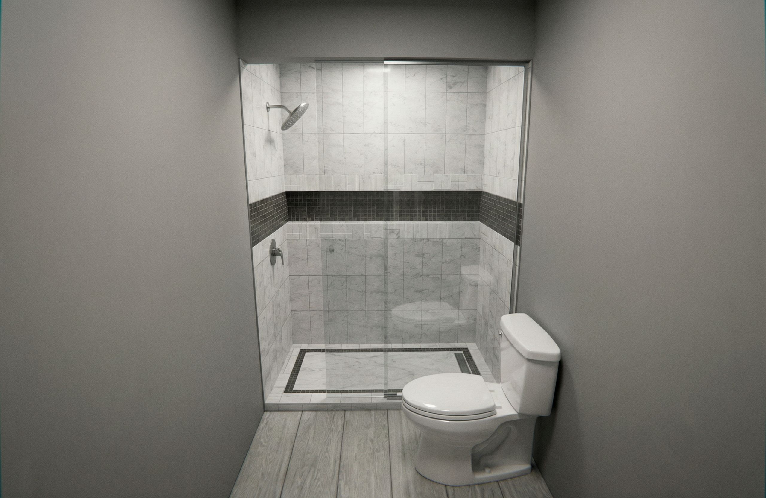 PromptPhoUltra photorealistic rendering of a small contemporary modern bathroom using the provided image as the exact reference. The reference image defines all layout, proportions, tile sizes, material placement, and orientation. Do not redesign, reinterpret, or substitute anything. How it appears in the model must be exactly how it appears in the render. Camera is positioned inside the bathroom at eye level, looking directly toward the shower. Use a 20–24mm wide-angle lens with a slight fisheye effect. The toilet is in the foreground on the right, and the shower is centered at the back. The space is a small interior bathroom with no windows. CRITICAL LAYOUT: Shower is recessed at the back wall. Shower head is on the left wall. Shower entry/opening is also on the left side. Toilet is on the right. No windows. CRITICAL MATERIAL SEPARATION: Tile exists only inside the shower. Do not apply tile to the main bathroom floor outside the shower. The bathroom has two distinct material zones: tiled shower area and wood floor outside. These must remain separate. WALL TILE: 6"x12" white and grey marble tile with soft, subtle veining. Honed finish. HORIZONTAL BAND: 1"x1" charcoal mosaic tile band running continuously across the shower and through the full-width niche. SHOWER FLOOR: 3"x6" white/grey marble border (same material as wall tile), inner narrow mosaic band, and a large-format slightly lighter white/grey marble tile in the center. Linear drain at the front edge. Slight slope toward drain. Layout must match exactly. MAIN FLOOR: Light wood plank flooring with a cool grey tone. Desaturated, slightly weathered grey color. Matte finish. No warm or yellow tones. OTHER MATERIALS: White porcelain toilet. Frameless clear glass shower enclosure. LIGHTING: Soft, neutral artificial lighting. Even illumination. No warm/yellow color cast. RENDER QUALITY: Ultra photorealistic, accurate texture scale, visible grout lines, subtle marble variation, realistic reflections. No stylization. Any change to layout, tile placement, material zones, shower orientation, or floor material is incorrect., keep exact camera angle