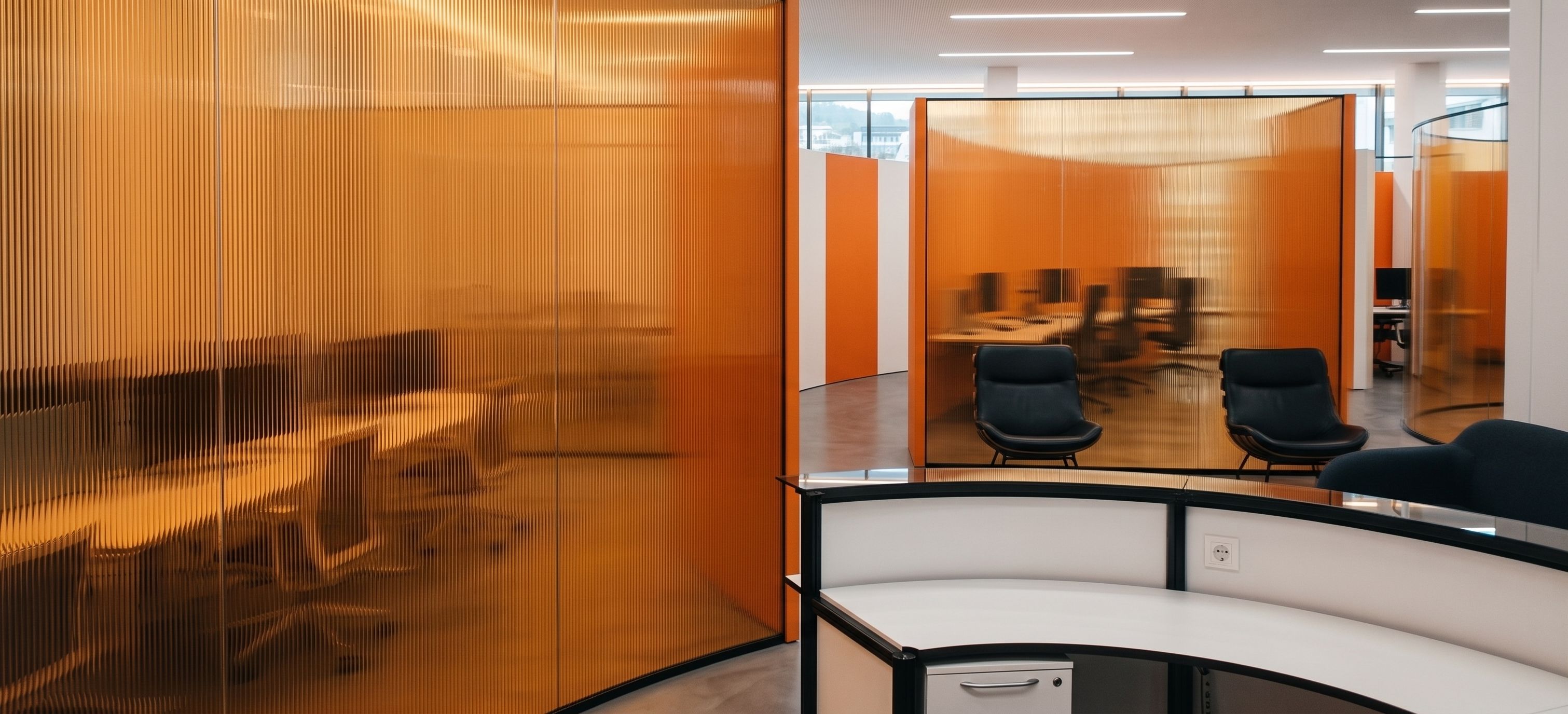 PromptInterior architectural photography, focused on a curved wall made of amber-orange fluted glass, vertical ribbed texture, translucent effect with soft blurry silhouettes behind. Grey microcement floor with satin reflections. High-end Swiss minimalist design, clean white ceiling, bright studio lighting, cinematic atmosphere, 8k, realistic glass refractions., keep exact camera angle