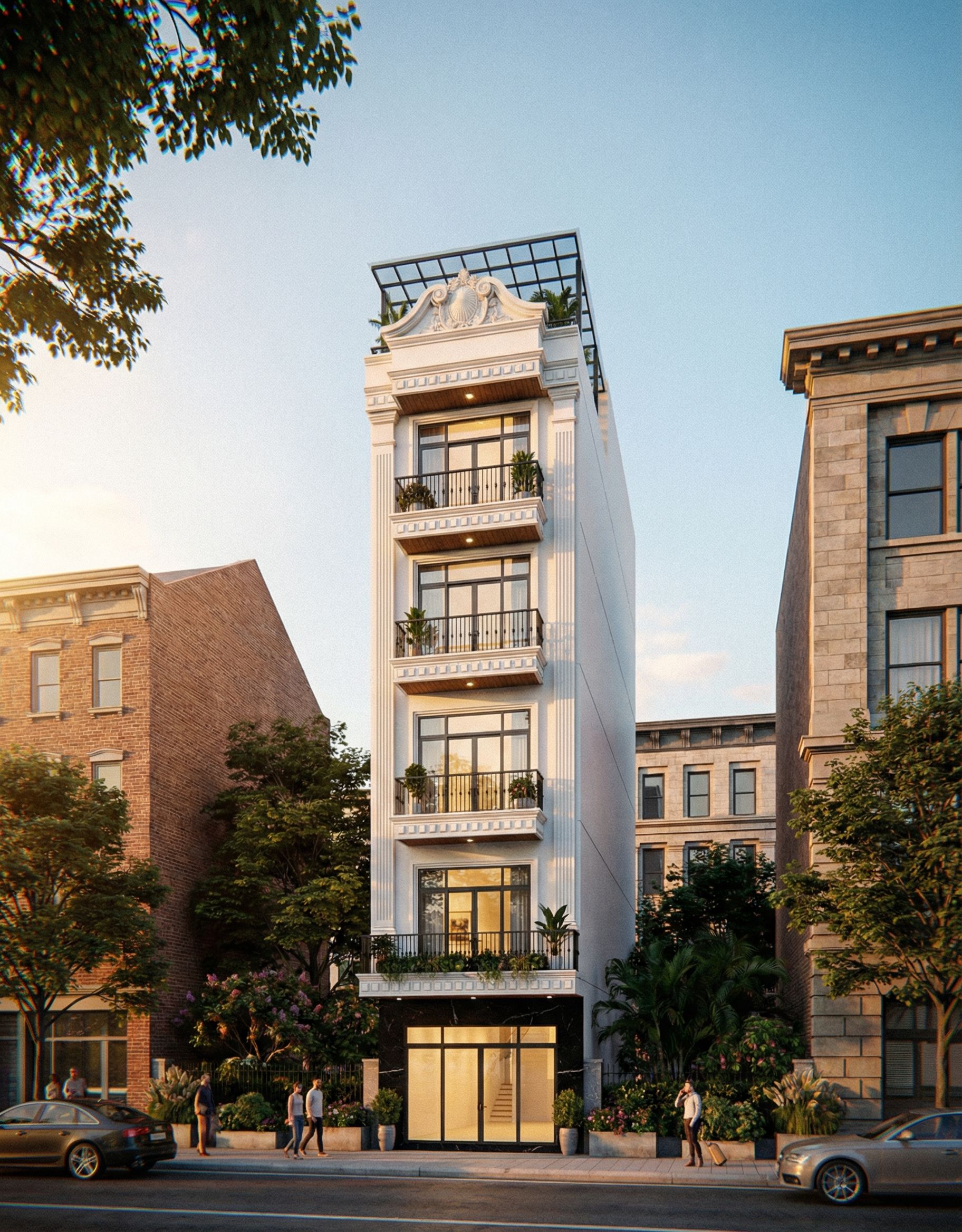 PromptThis photograph captures an elegant multi-story apartment building, showcasing striking architectural details such as classical columns and ornate cornices. The facade features large glass windows with stylish balconies, creating a sophisticated blend of traditional and modern design. The entire building is painted white, highlighted by a black stone cladding with subtle light veins on the first floor. The railings are made of black painted metal. Surrounded by urban landscapes, neighboring buildings add context and depth. The scene is illuminated by soft daylight, creating subtle shadows and accents on the textured surfaces. The materials—glass, paint, wood, metal, and stone—are rendered sharply and realistically. The photograph was taken from the original sketch angle using a wide-angle lens to emphasize the building's grandeur and symmetry., keep exact camera angle