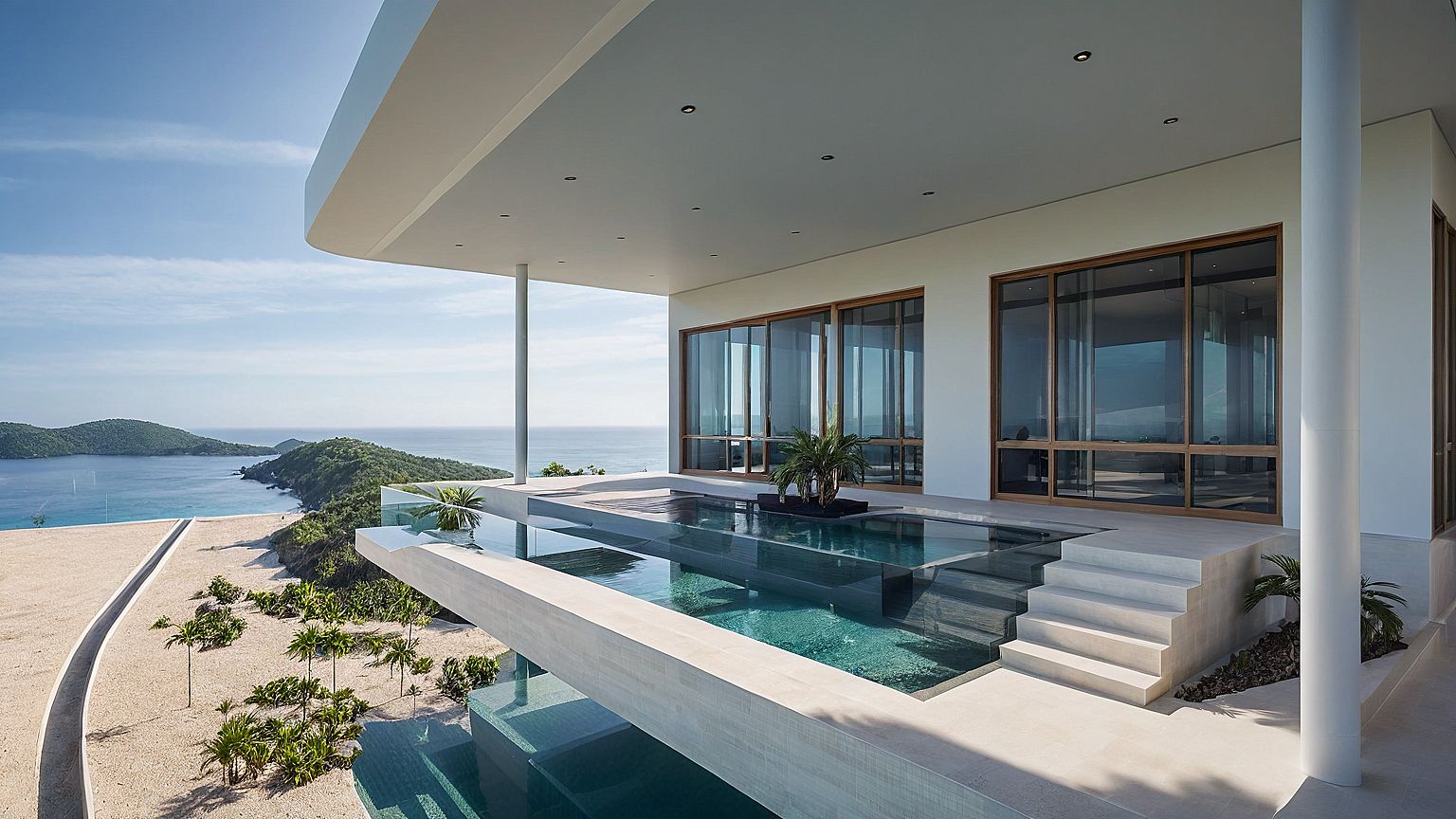 PromptPhoto of a modern seaside villa featuring an infinity pool with accentuating glass walls, designed with sleek lines and a minimalist aesthetic. Emphasize the smooth textures of the building materials, including polished concrete and glass. Set against a backdrop of gentle hills and a serene ocean, with beach and palm trees in the foreground. Soft natural light illuminates the scene, highlighting reflections in the water. Captured from a high-angle perspective, with a wide lens that showcases the expansive view and harmonious integration with the landscape.