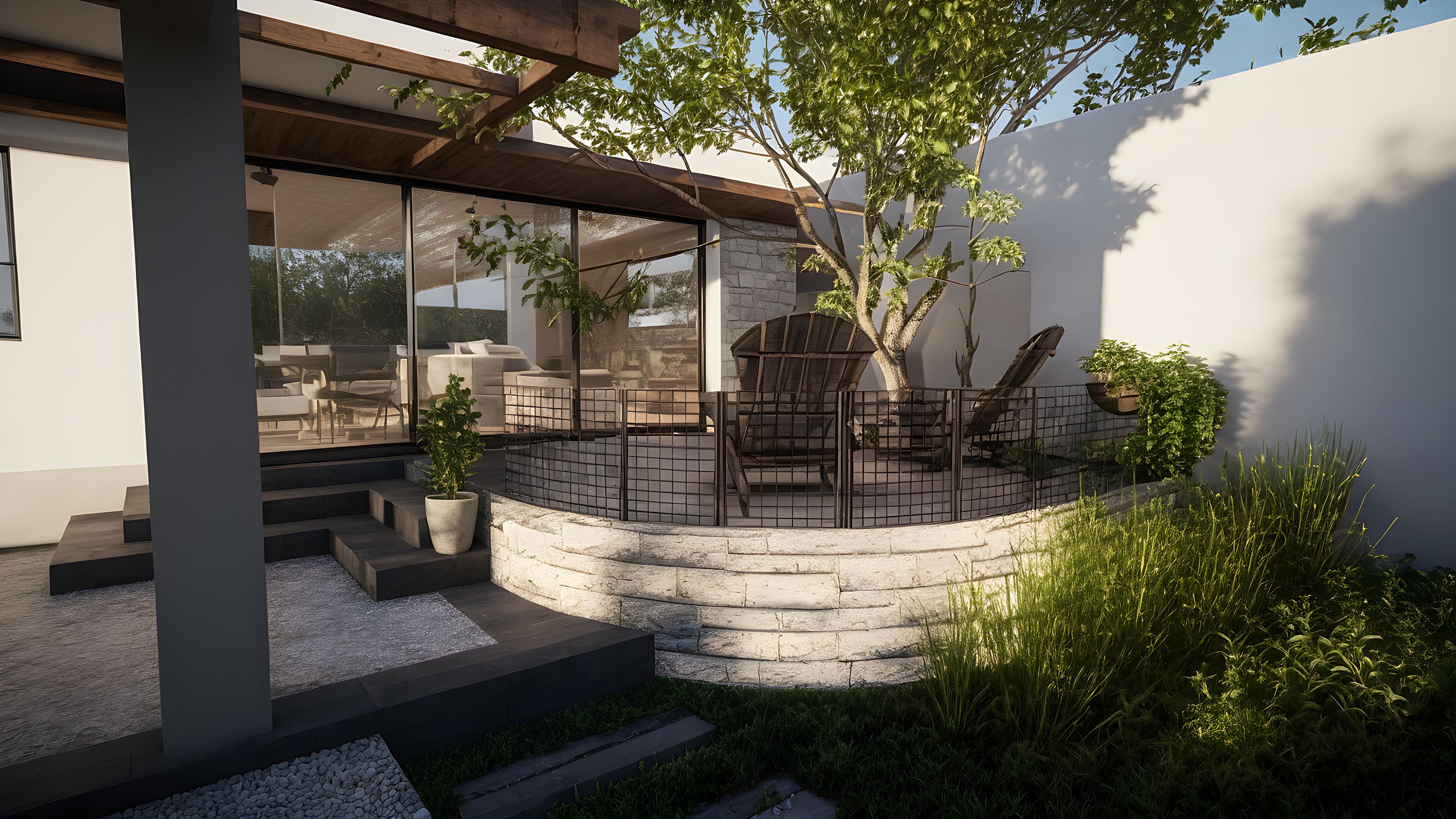 PromptES EL PATIO TRASERO DE UNA VIVIENDA CON MUCHA NATURALEZA, LA VIVIENDA TIENE UN ESTILO TRANSICIONAL.