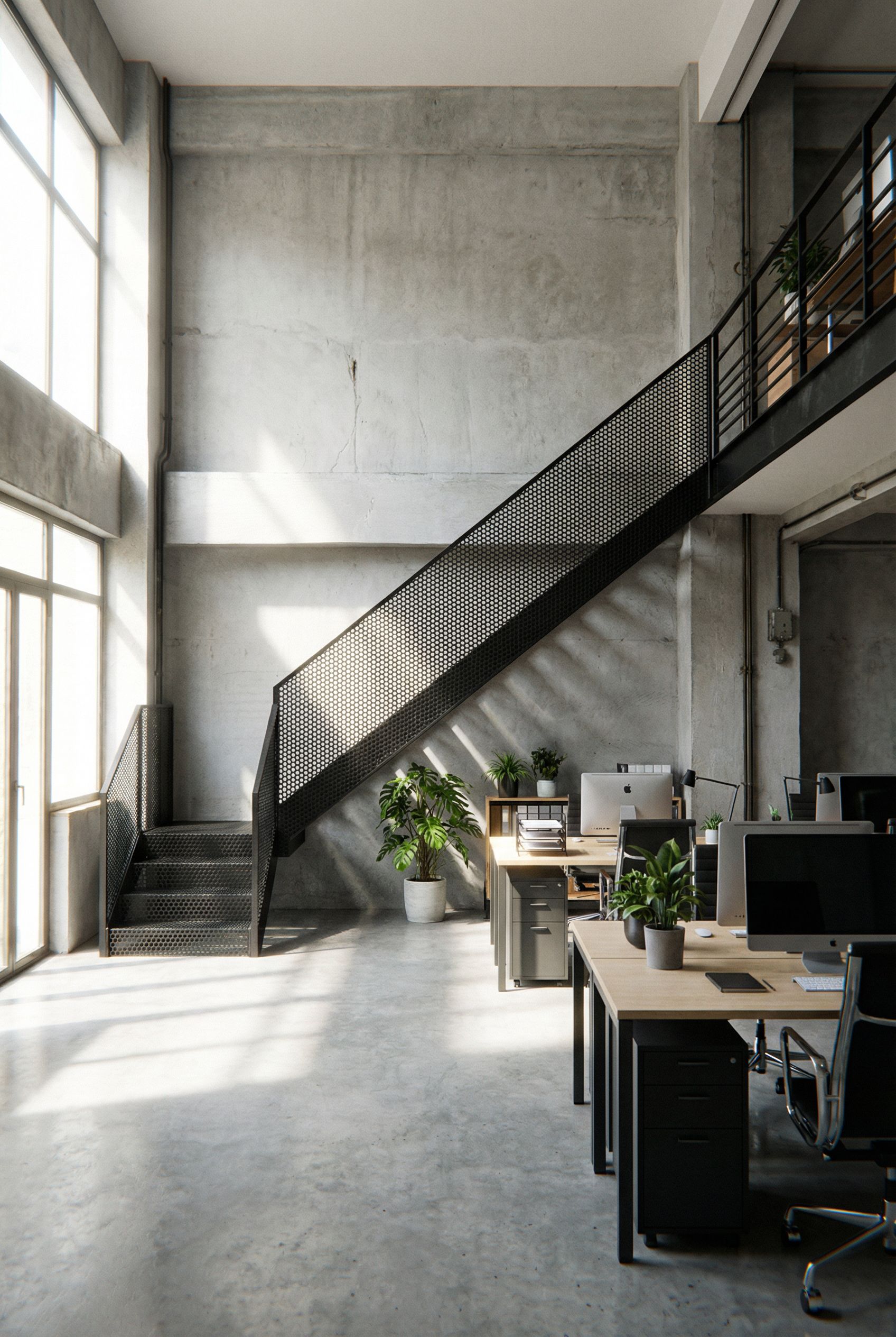 PromptIndustrial interior, offices, place a linear stair like reference 1, keep exact camera angle