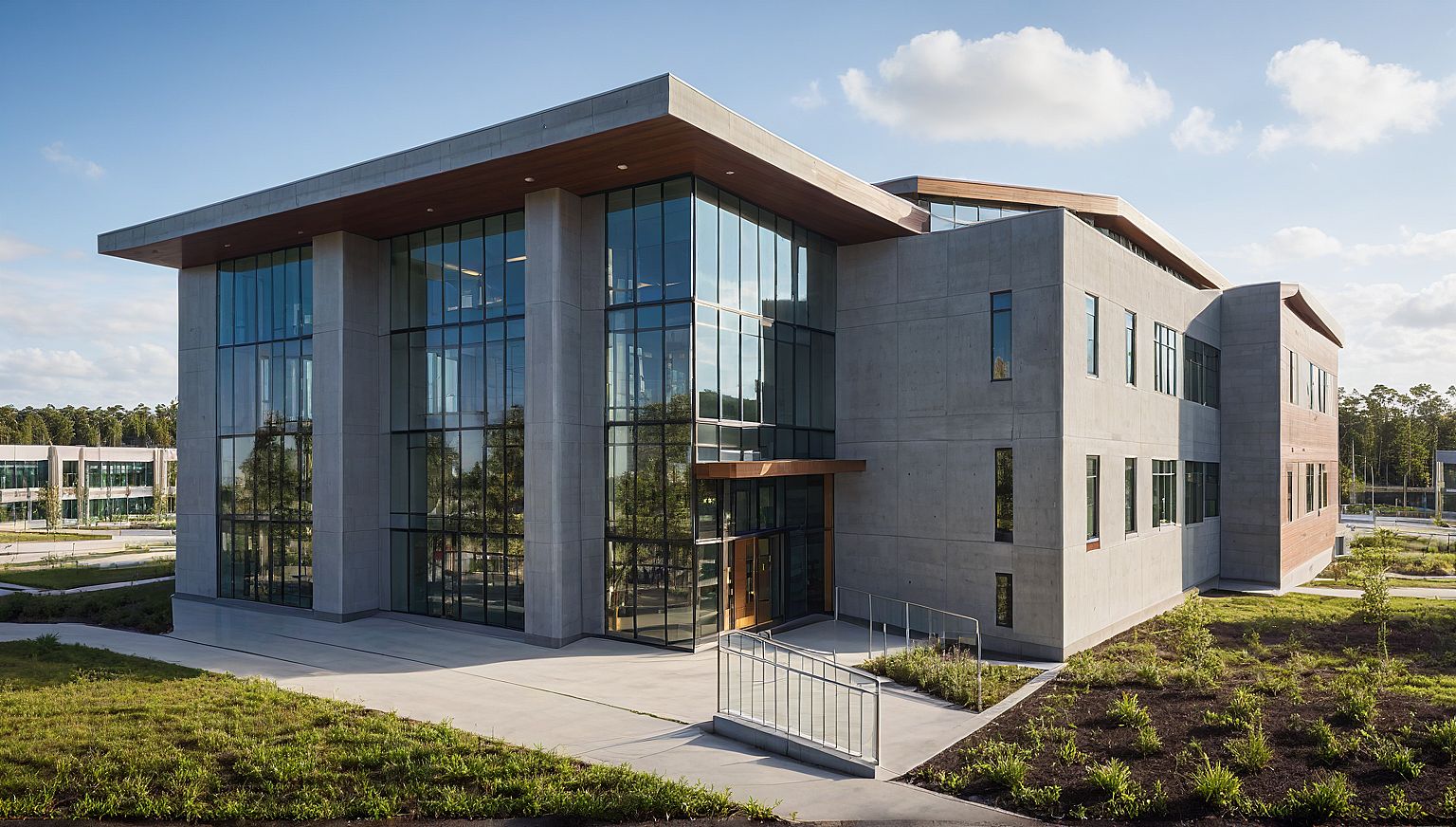 PromptPhoto of a modern School building featuring a combination of smooth concrete and warm steel elements. Large glass windows dominate the façade, providing a sense of transparency and connection with the landscape. Set against a vibrant urban backdrop with greenery surrounding, the scene captures bright, natural daylight illuminating the structure, casting soft shadows. It includes students roaming the grounds in uniform. A low-angle perspective highlights the building’s unique roofline and entrance, evoking a welcoming atmosphere. The rendering should achieve lifelike qualities, emphasizing the sleek textures and harmonious integration with the environment.