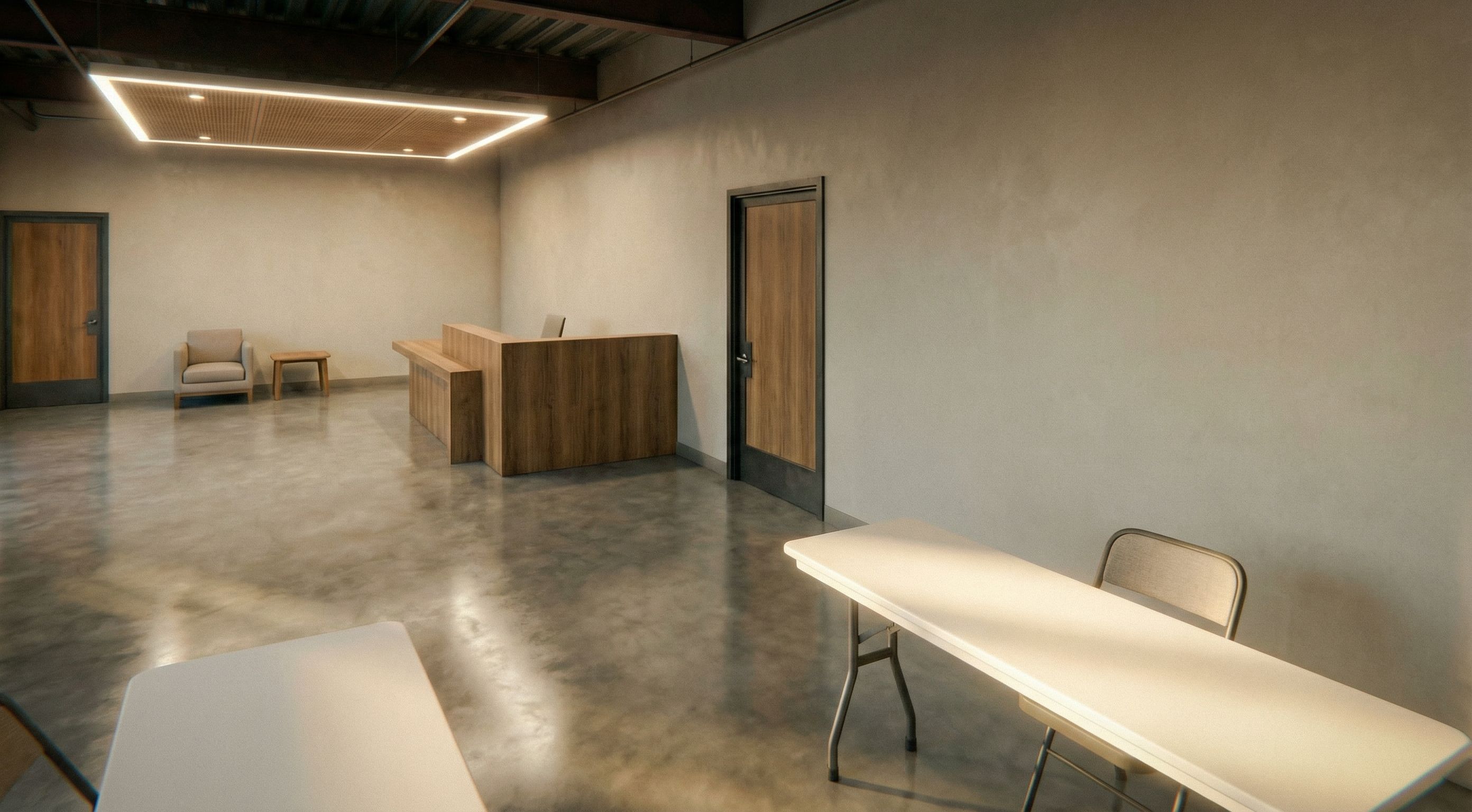 Transform this existing Revit interior camera view to match the aesthetic and atmosphere of the provided reference image while preserving the original geometry, layout, furniture placement, proportions, and camera perspective exactly as shown. Do not change the view or redesign the space. Apply a refined modern wellness lobby aesthetic with warm industrial character. Introduce layered architectural lighting combining soft natural daylight and warm overhead linear lighting. Create gentle lighting hierarchy with brighter foreground illumination, soft midtones, and slightly diffused background depth. Reduce harsh shadows and improve light bounce to create an open, calm atmosphere. Enhance material realism while maintaining existing surfaces: warm natural wood tones with visible grain, matte neutral plaster walls, polished concrete flooring with soft diffused reflections, and dark exposed steel ceiling elements with subtle variation. Improve global illumination and add soft ambient occlusion at wall intersections, furniture bases, and ceiling structure for depth. Apply cinematic architectural color grading inspired by the reference: warm highlights, neutral midtones, slightly cooler shadows, balanced contrast, clean professional wellness atmosphere. Maintain neutral color palette without introducing new accent colors. Add subtle photoreal refinement: soft light bloom around fixtures, realistic contact shadows, gentle atmospheric depth, and clean high-end architectural visualization quality. Use the reference image only to influence lighting quality, material richness, warmth balance, and overall mood — not layout or composition. Do not alter architecture, do not change camera angle, do not add or remove furniture, no new decor elements, no geometry changes, no fisheye distortion, no heavy HDR, no oversaturation., keep exact camera angle
