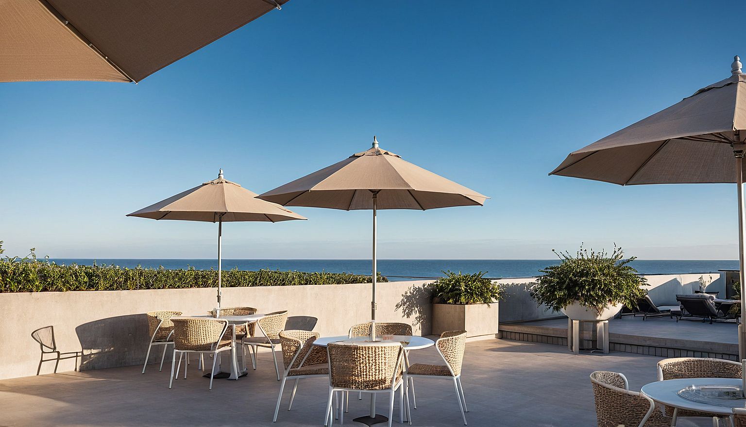 Photo of a modern rooftop terrace featuring elegant outdoor seating beneath beige parasols. Emphasize the sleek, contemporary design with woven wicker chairs and sleek metal tables. The beach with a vast shoreline and sunset serves as a backdrop, and greenery. Natural evening sunlight casts soft shadows, highlighting the textures of the furniture and potted plants. The camera angle is slightly elevated, giving a panoramic view, with a wide-angle lens capturing the expansive sense of space and vibrant atmosphere.
