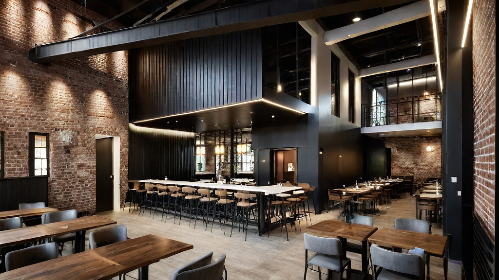 PromptInterior seating area of a Jamaican fine dining restaurant with a modern industrial style. The space features existing weathered brick walls and white color on the new wall. Combination a mix of wooden and metal structural frames, and wood flooring. Industrial style light sconces provide warm ambient lighting. The furniture includes dark wood tables and modern seating, creating a sophisticated bright and colorful atmosphere.