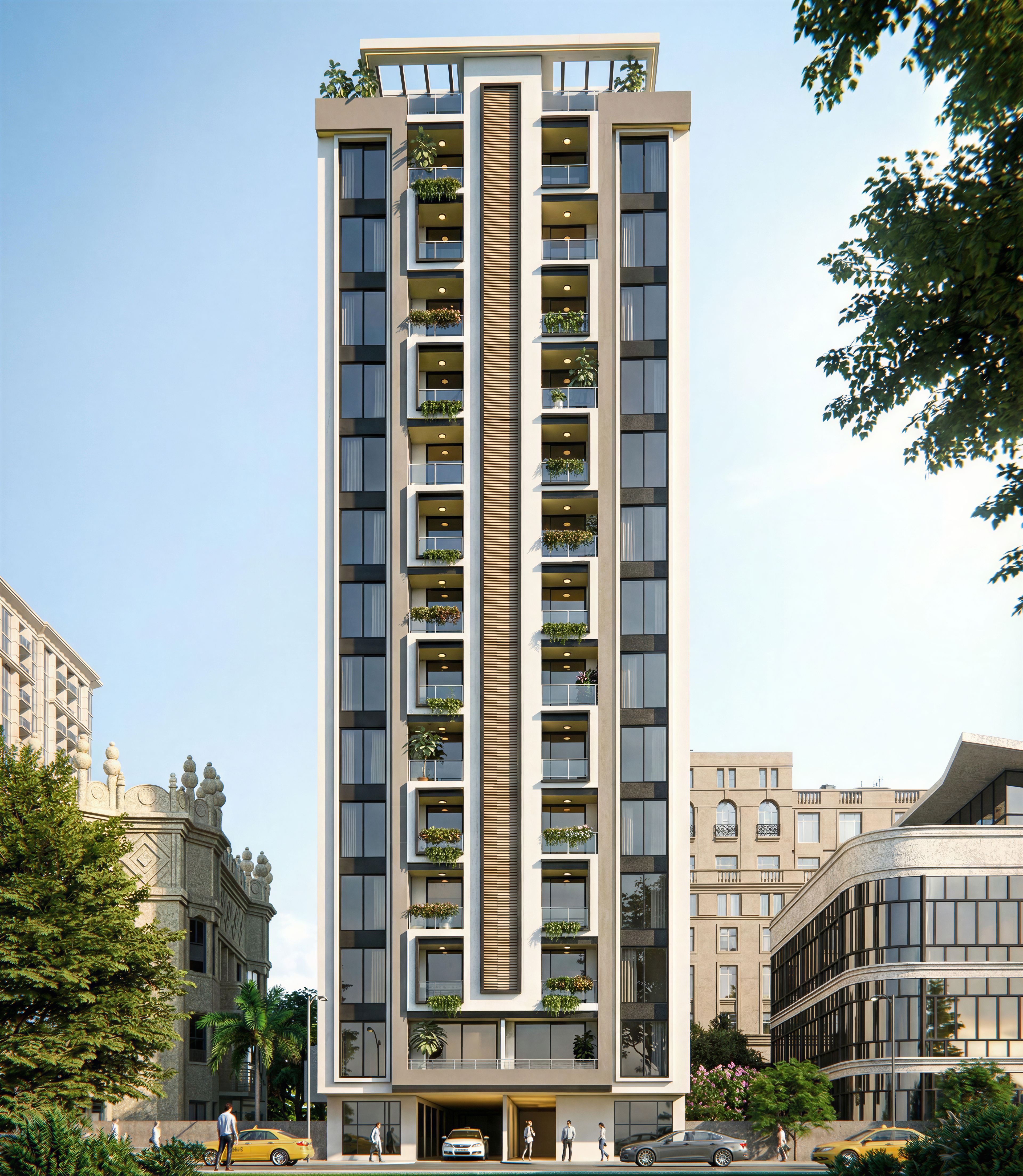 PromptPhoto of a modern residential high-rise building, featuring sleek glass facades and defined horizontal lines. Architectural details include balconies with planters and an elegant entrance. Set in an urban environment surrounded by historical and contemporary structures, with lush greenery at the foreground. Soft evening light casts gentle shadows across the facade, enhancing texture contrasts. Captured from a slight low angle, emphasizing height and grandeur, with a wide-angle lens to encompass nearby buildings and vibrant street life., keep exact camera angle