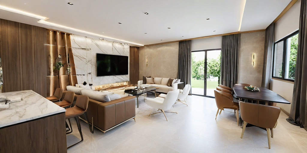 style is modern and minimalist with a focus on neutral colors. the furniture is made of a mixture of light wood light brown leather neutral colors and The style suggests a modern or contemporary aesthetic. stylish and functional. The style is modern and sophisticated, with a focus on luxury materials. A striking feature wall behind the TV is adorned with marble or a similar stone, adding a touch of elegance.