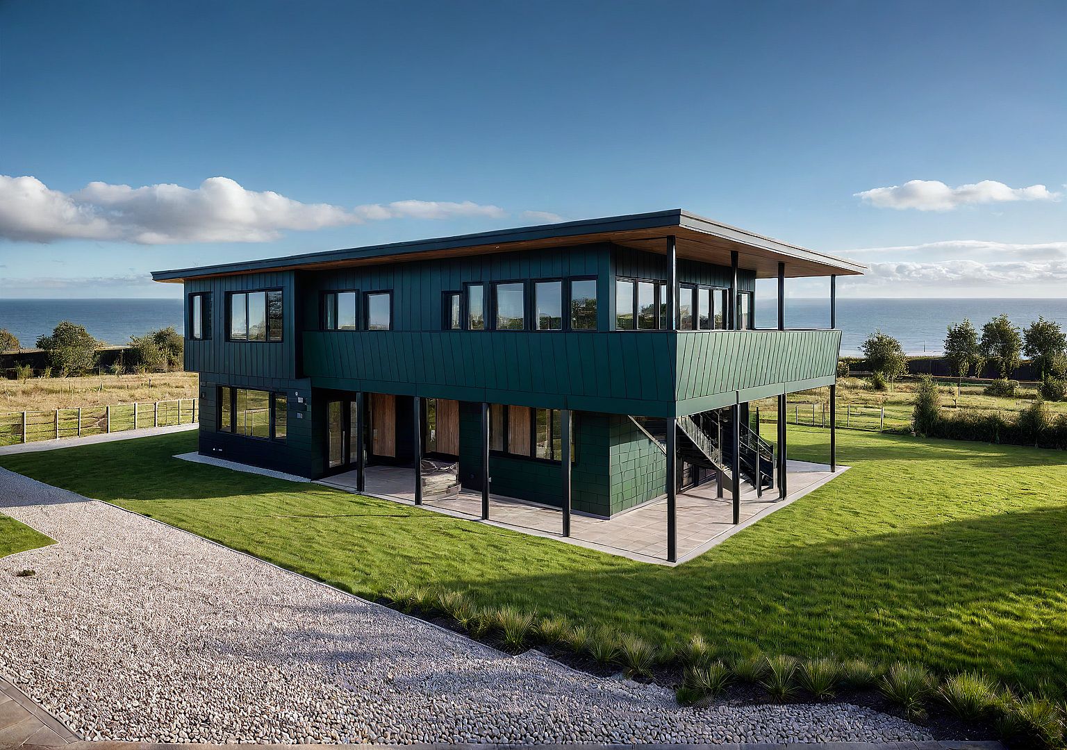 PromptDark green cladding, flat grass site, timber ceiling, tiled ground floor of house