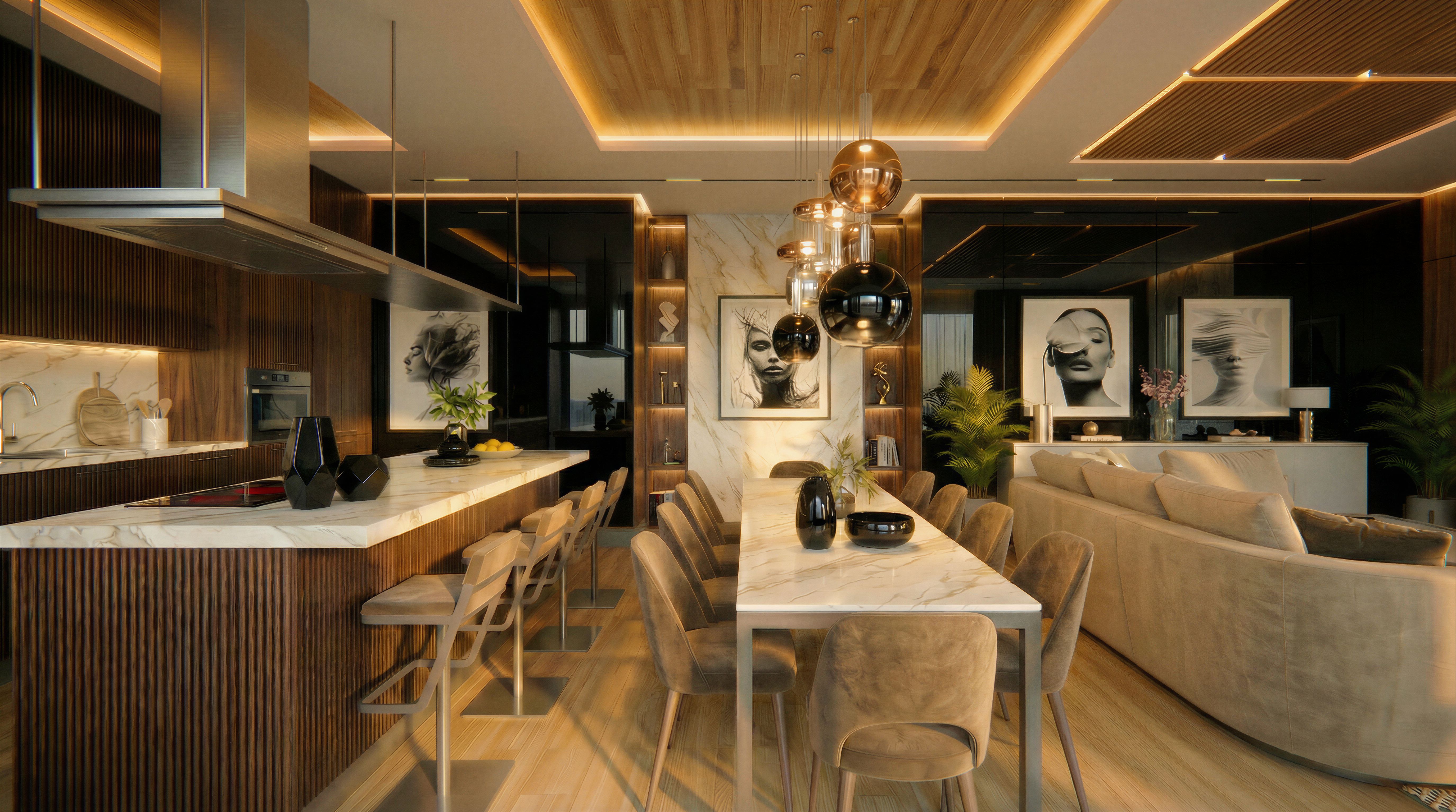PromptDa mayor definición de la madera que está en los falsos techos para que se vea con más claridad. coloca entre las lámparas del techo uno o dos globos de cristal en negro.