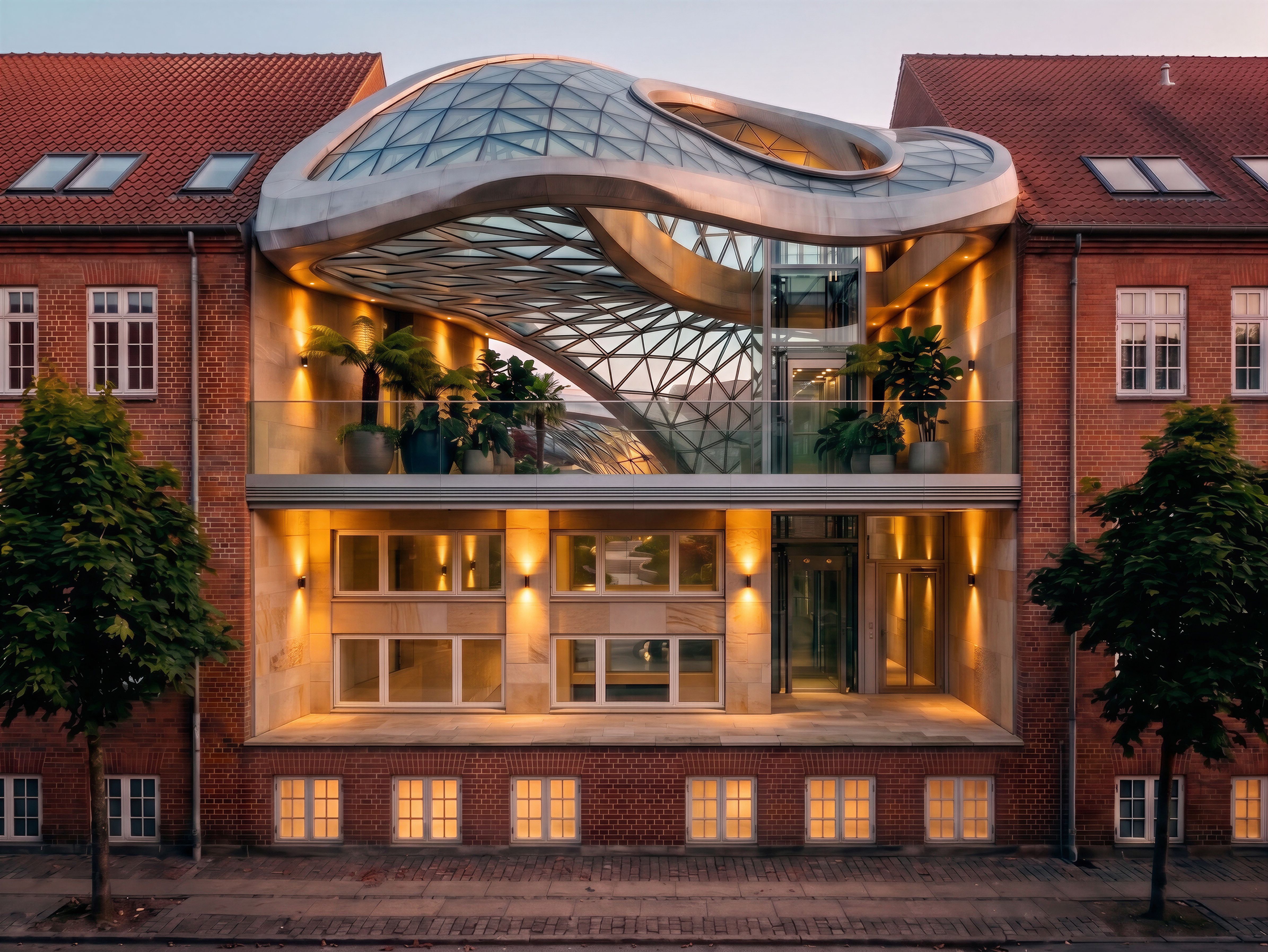 EnhancedPromptEdit this image. Change the height of the terrace floor. The terrace, where the plants and elevator are visible, is located on the second floor of the building. The floor needs to be raised 3 meters above the base image level. Below the terrace, there are undoubtedly two horizontal rows of three windows., keep exact camera angle