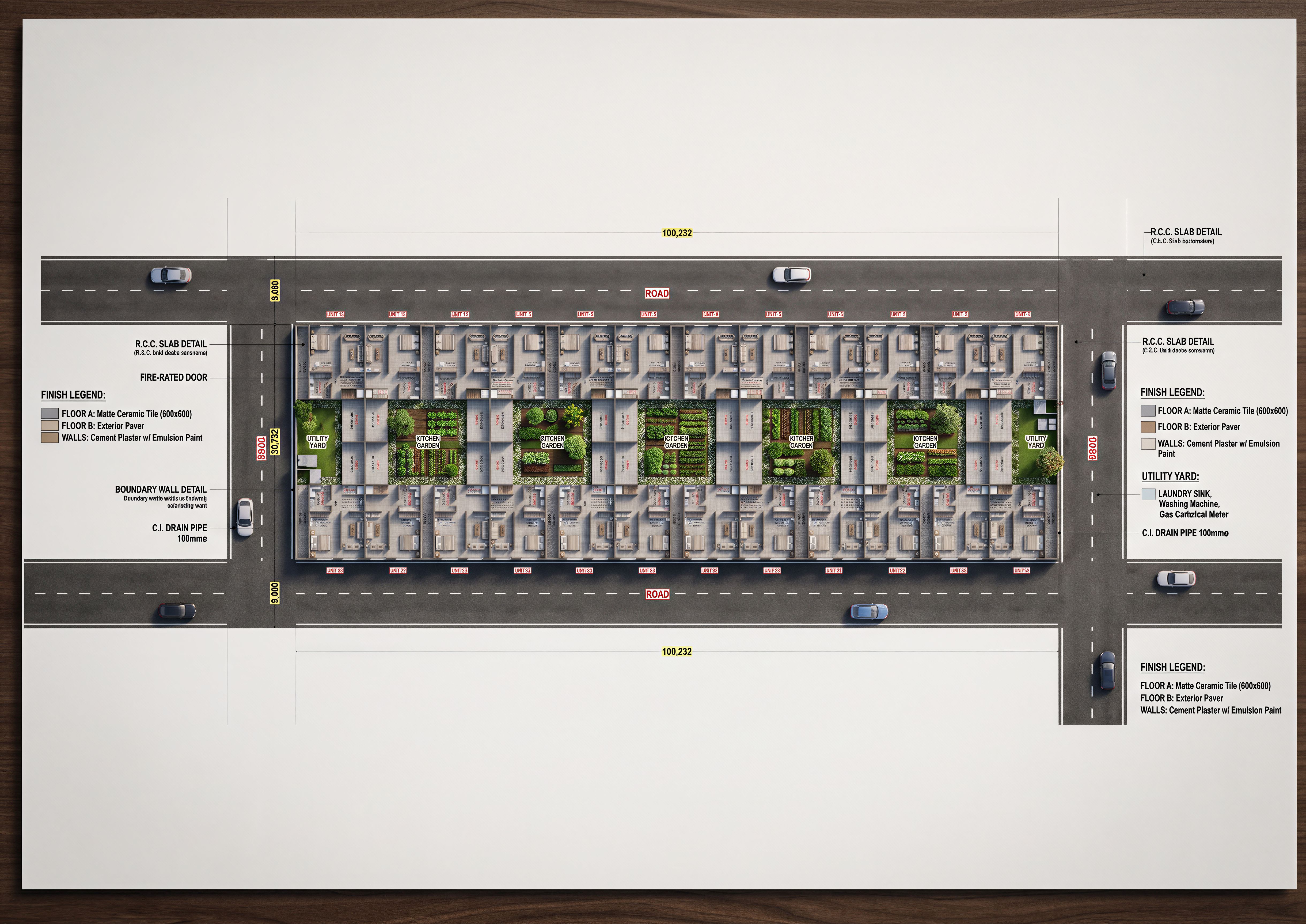 EnhancedPromptLAYOUT SHOWING THE INTERIOR OF A HOUSE CLEARLY SHOW THE PARTITIONS WITH THE FLOOR FINISHES. USE CERAMIC TILES ON THE FLOORS. INCLUDE A UTILITY AND KITCHEN YARD AREA. CLEARLY INDICATE THE WASHROOMS. MAKE LAYOUT HIGH RESOLUTION OF 8K. SOME LANDSCAPING IN THE COURTYARD AREA INDICATED IN GREEN.USE ORIGINAL LAYOUT DESIGN AND NUMBER OF UNITS CLEARLY INDICATED. USE ORIGINAL LAYOUT AND CLEARLY SHOW PASSAGE BETWEEN UNITS., keep exact camera angle
