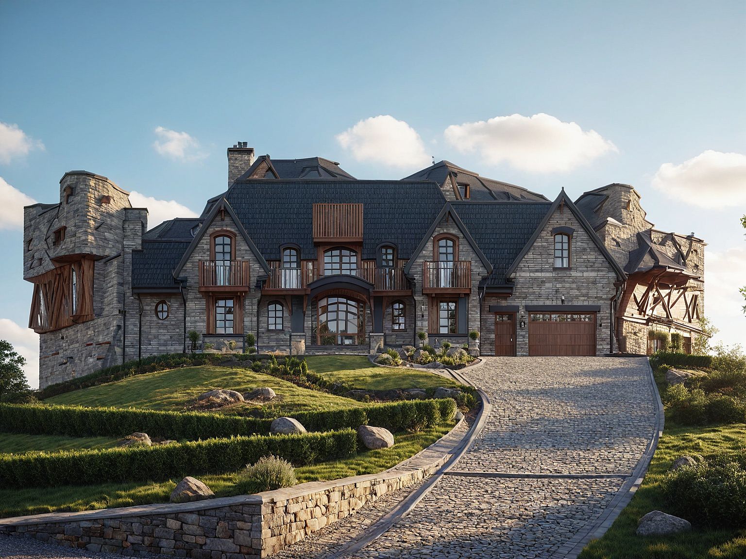 PromptA modern English craftsman facade. On a hill with mid-morning sun. Brick facade with stone and wood accents. A winding driveway.