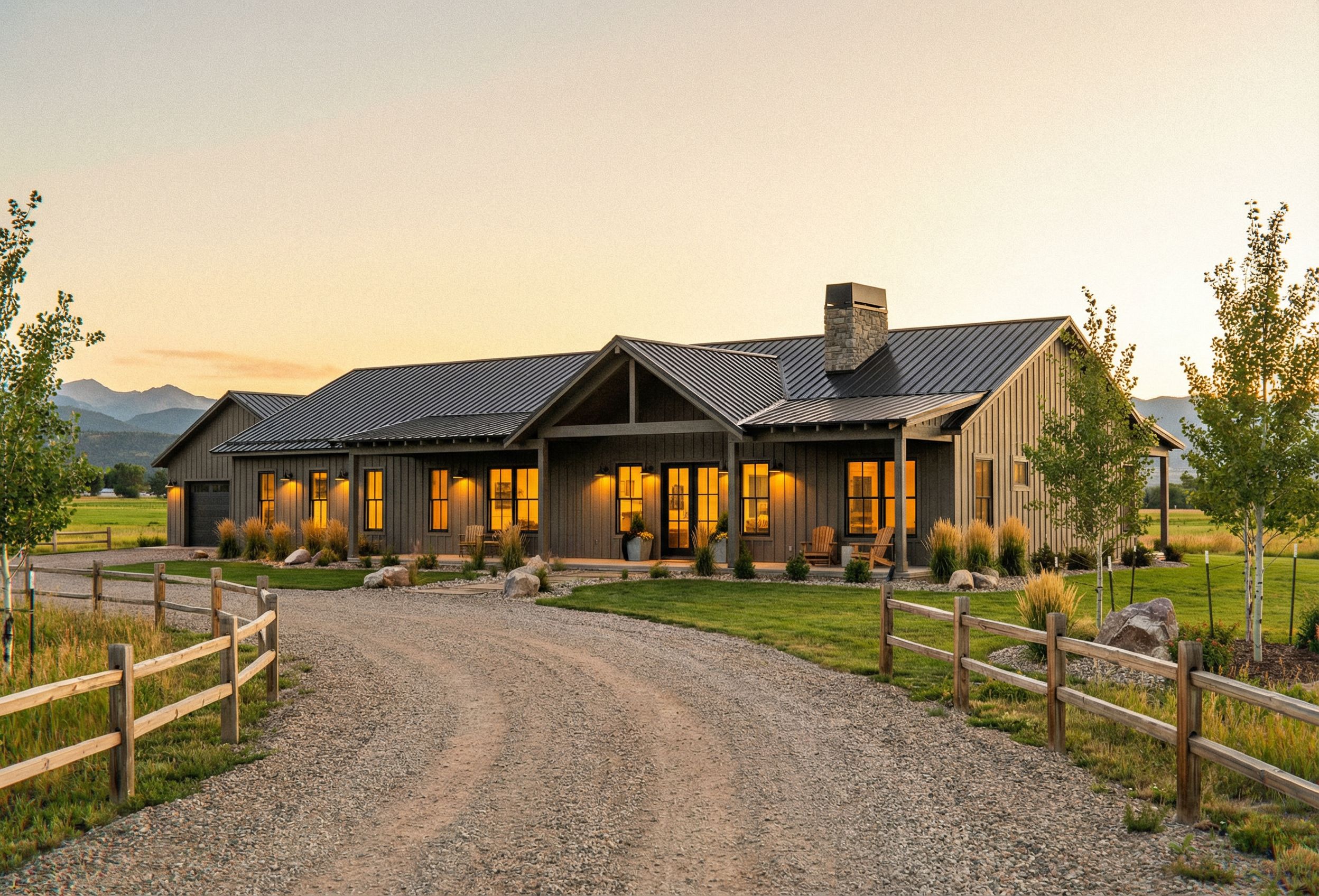 Site this building in a luxury rural property in the foothills of colorado with aspens and green fields. There are split post wood railings lining the driveway approach which winds both in front of the house as well as to the back left for the side load garage. Keep this image true to all the window and door styles, sizes and locations. Add stone to the chimney and add a modern metal shroud to cap it. The metal roof and shroud will all be a matte black. Vertical board and batt siding to be a complimentary dark warm grey. Add modern industrial lighting and matte black door handles on the front pair of doors. lightly light the interior for a warm glow from all windows. Landscaping is complimented by grasses and small boulders or rocks. This home and landscaping should shine as an on point, current, clean example of what everyone wants in a barndominium style home., keep exact camera angle
